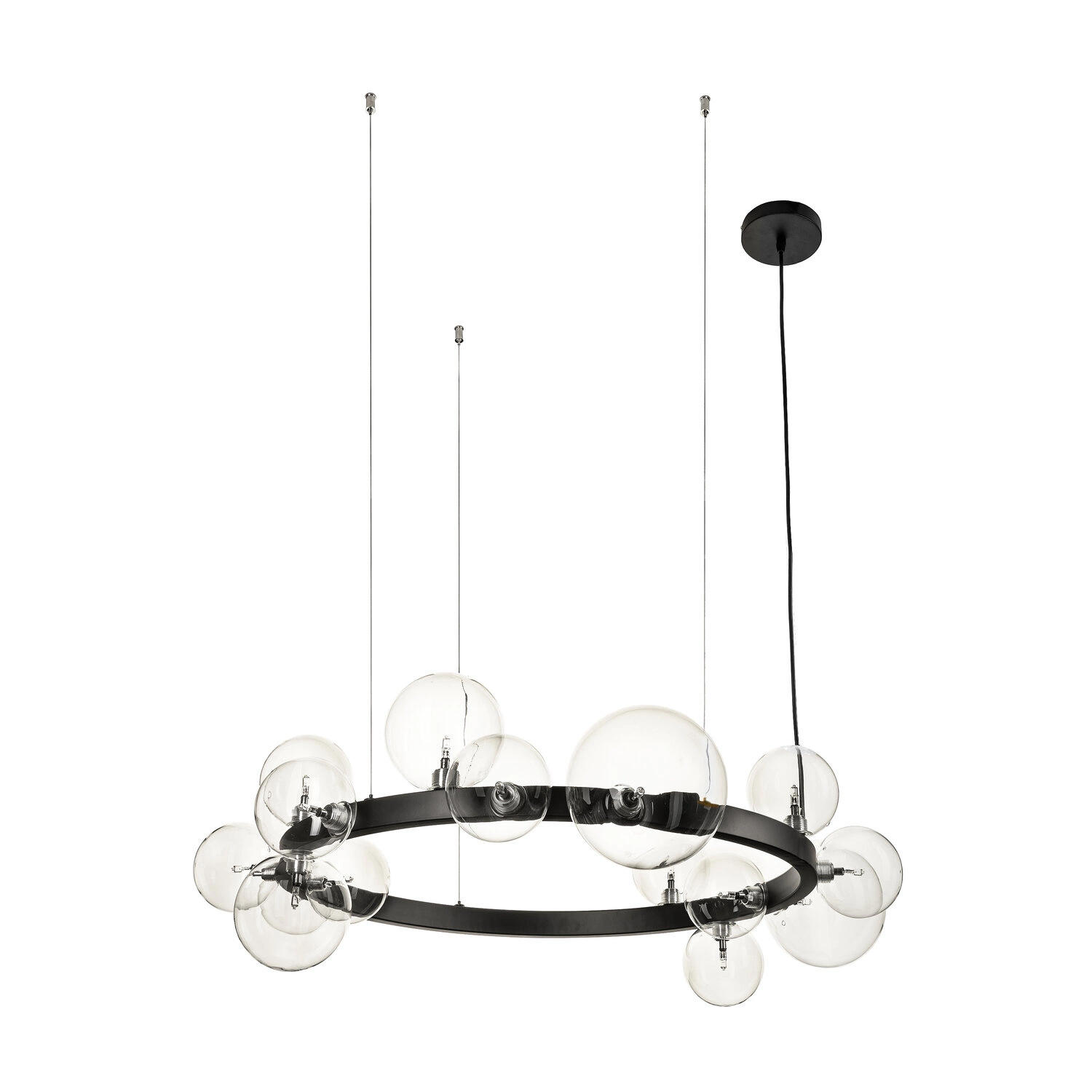 Orion to lampa wisząca kula zaprojektowana z myślą o nowoczesnych i industrialnych wnętrzach. Metalowa konstrukcja w matowej czerni tworzy mocny akcent dekoracyjny, znakomicie komponując się zarówno z surowymi, jak i minimalistycznymi aranżacjami. Transparentne szklane klosze o trzech różnych średnicach (15, 12 i 10 cm) rozmieszczone na okręgu, tworzą niepowtarzalny efekt świetlny, podkreślając wyjątkowy klimat pomieszczenia.