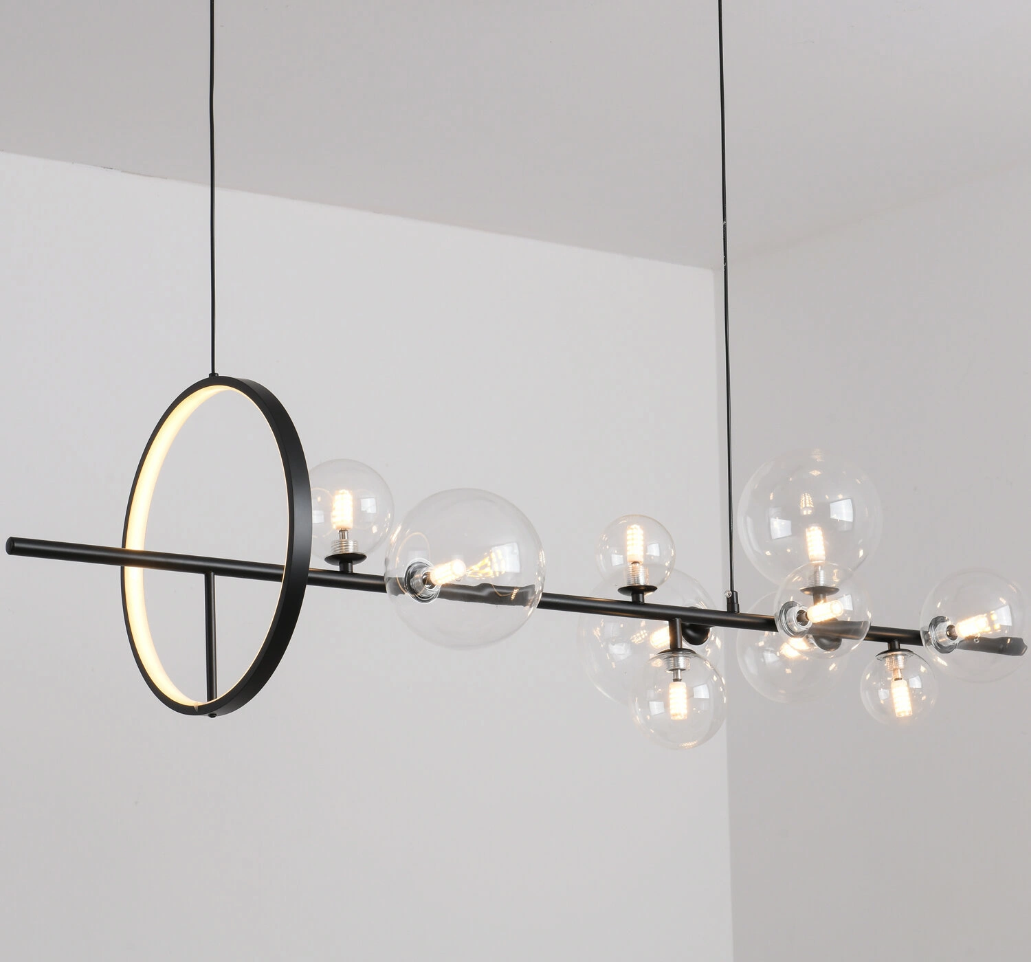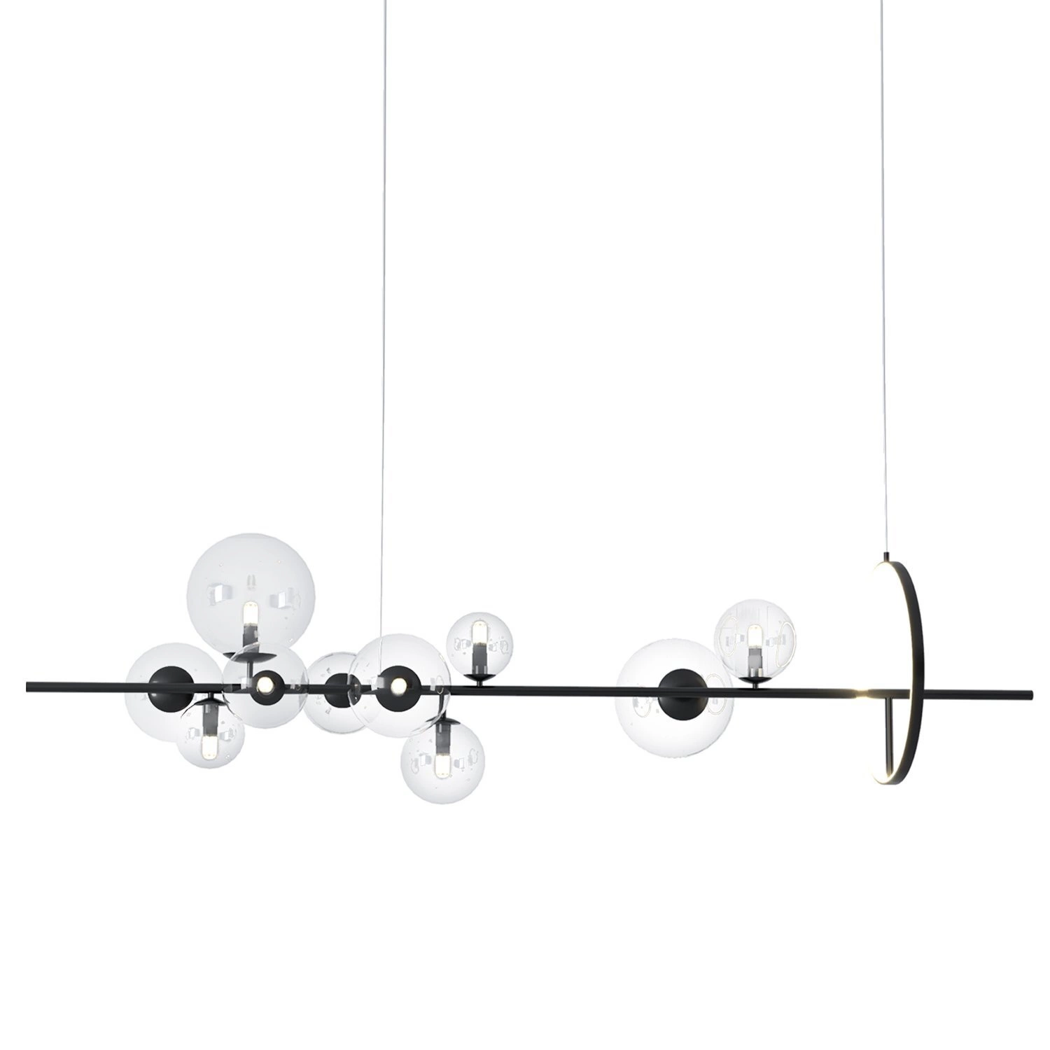 Lampa wisząca kula Orion Long czarna 120 cm marki Step into Design to nowoczesne oświetlenie sufitowe, które przyciąga wzrok niebanalną formą i funkcjonalnością. Wykonana z wytrzymałego metalu oraz transparentnego szkła, posiada aż 11 źródeł światła LED, zapewniając równomierne oświetlenie przestrzeni. Wyjątkowa długość oraz regulowana wysokość zawieszenia czynią ją idealnym wyborem zarówno do salonu, jak i nad wyspę kuchenną lub stół w jadalni.