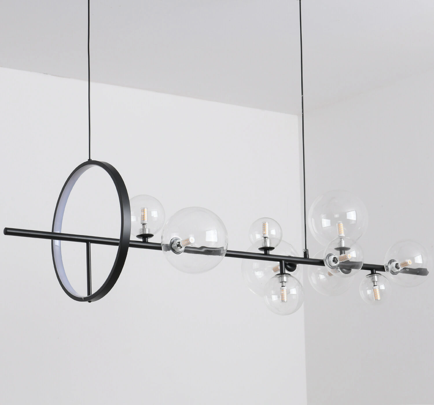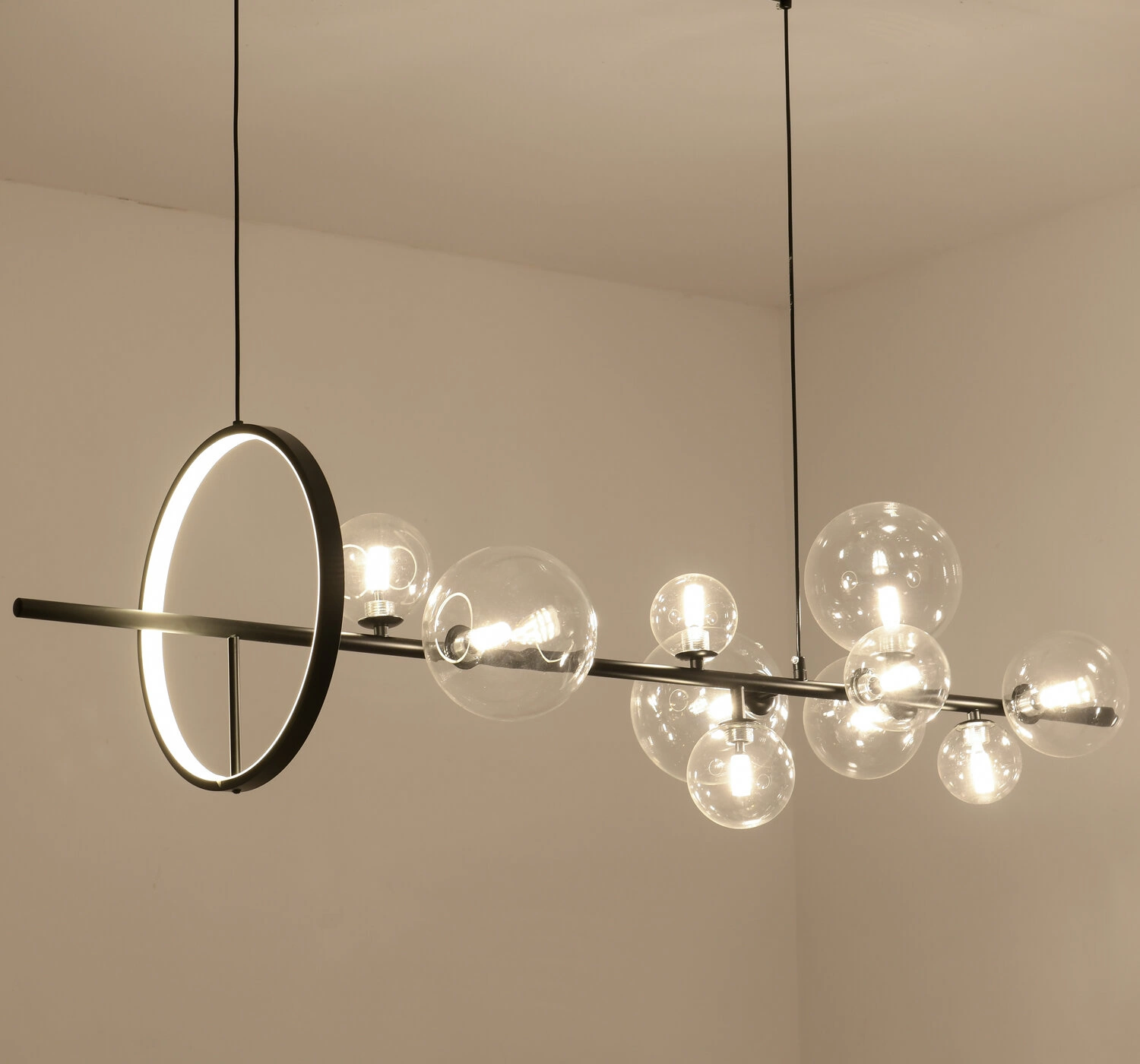 Lampa Orion Long to esencja nowoczesnego stylu z nutą industrialnej elegancji. Czarna, matowa konstrukcja efektownie kontrastuje z transparentnymi szklanymi kulami o różnych średnicach (8, 10, 12, 15 cm), tworząc unikalną kompozycję świetlną. Dzięki szerokości 120 cm oraz możliwości regulacji wysokości do 200 cm, żyrandol ten doskonale prezentuje się zarówno w przestronnych salonach, jak i nad kuchenną wyspą, podkreślając wystrój i charakter Twojego domu.