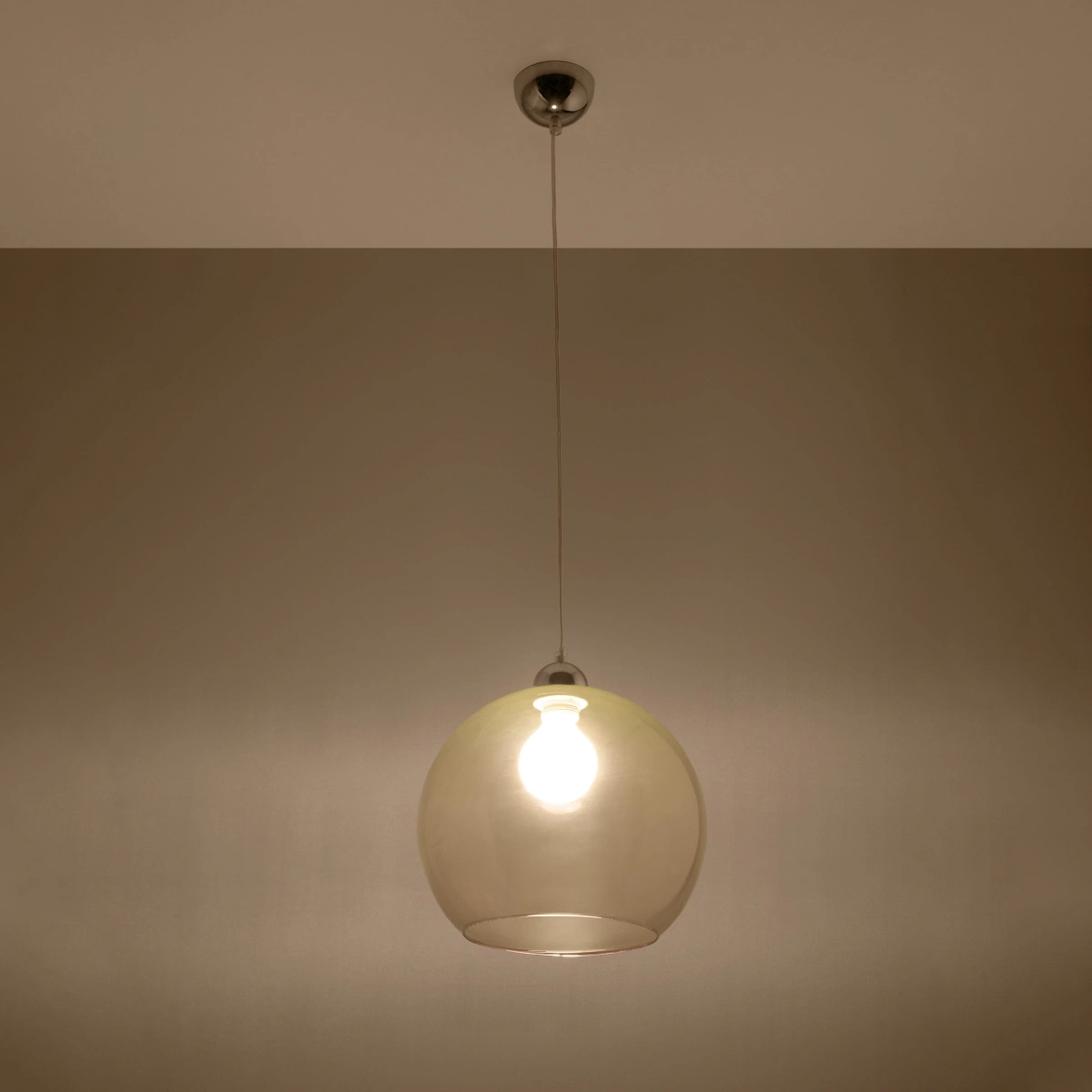 Lampa wisząca kula szklana BALL marki Sollux Lighting to połączenie nowoczesnego designu z subtelną elegancją. Wykonana ze szkła i metalu, w modnym szampańskim odcieniu beżu, stanowi wyrazisty akcent do salonu, jadalni lub nad wyspę kuchenną. Jej średnica 30 cm oraz regulowana wysokość do 120 cm idealnie wpisują się w potrzeby współczesnych wnętrz, a pojedyncze źródło światła z gwintem E27 pozwala dopasować natężenie i barwę oświetlenia do własnych preferencji.