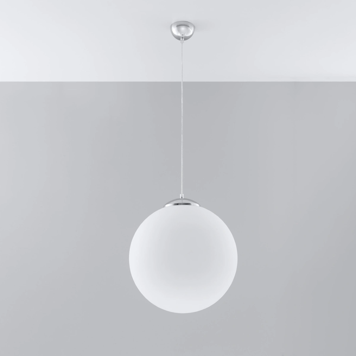 Lampa wisząca kula UGO 40 chrom marki Sollux Lighting to nowoczesna propozycja oświetlenia sufitowego, która zachwyca minimalistyczną formą i elegancją szklanego klosza o średnicy 40 cm. Połączenie białego szkła z chromowanymi detalami sprawia, że model ten doskonale wpisuje się w aktualne trendy wnętrzarskie. Dzięki regulowanej wysokości do 130 cm, lampa pozwala na precyzyjne dopasowanie do aranżacji salonu, jadalni, kuchni lub przestrzeni nad stołem czy wyspą kuchenną.