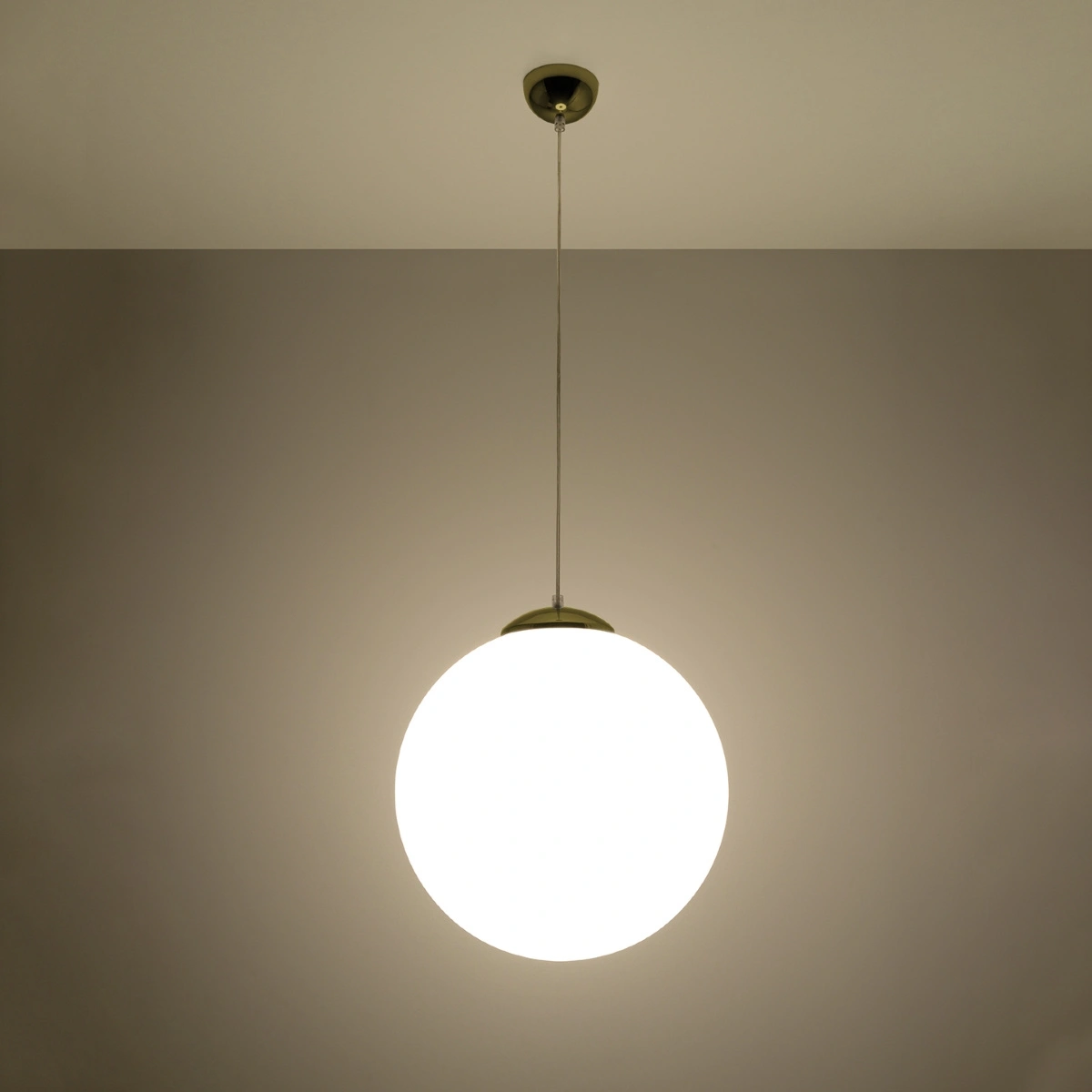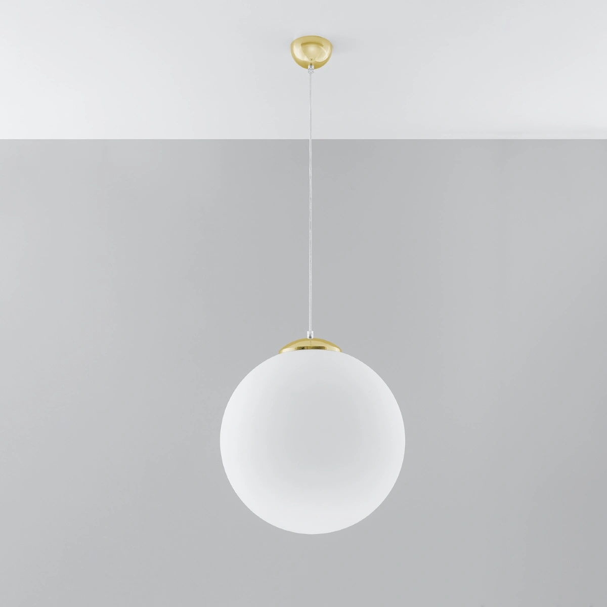 Lampa wisząca kula UGO 40 marki Sollux Lighting to połączenie nowoczesnego designu i szlachetnej elegancji. Wykonana z mlecznobiałego szkła oraz złotych detali ze stali, zachwyca geometryczną formą o średnicy 40 cm i funkcjonalnością. Zawieszona na długości do 130 cm, świetnie sprawdzi się jako główne oświetlenie w salonie, jadalni, nad stołem, a także w kuchni lub nad wyspą, tworząc wyrazisty akcent aranżacyjny.