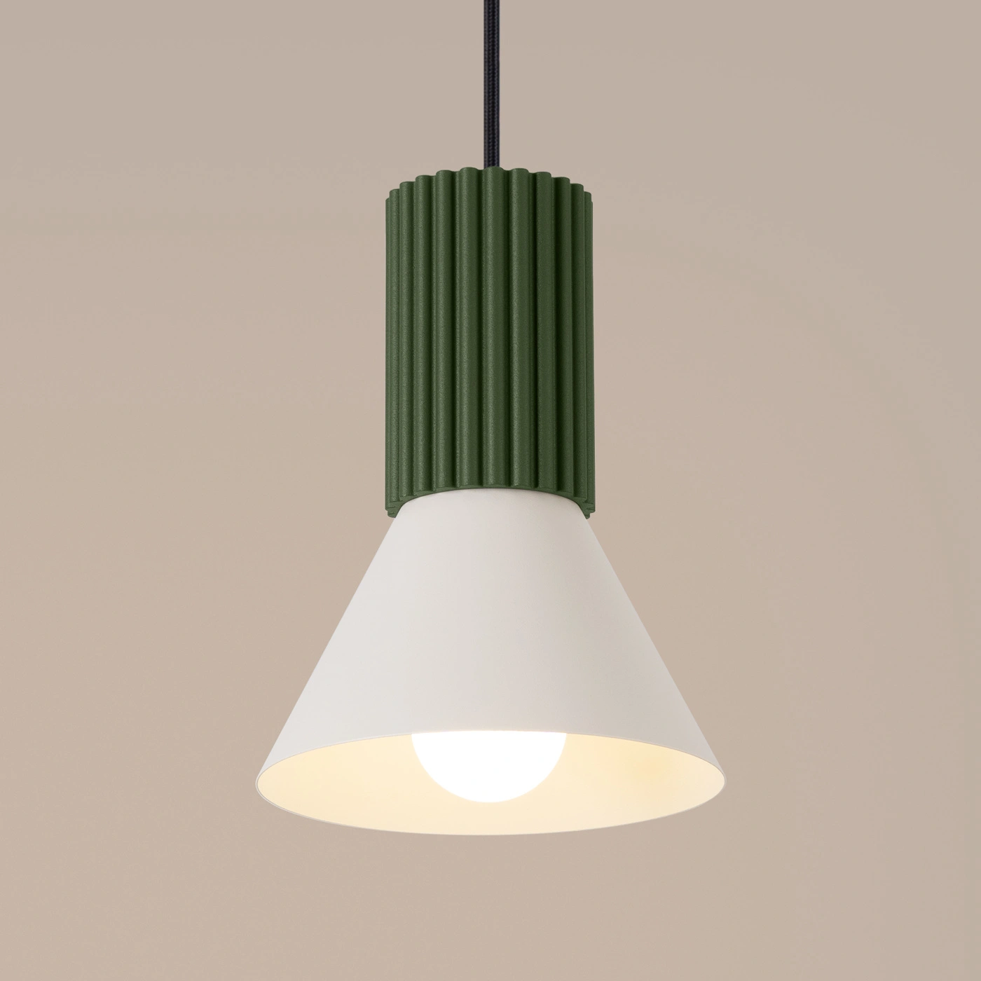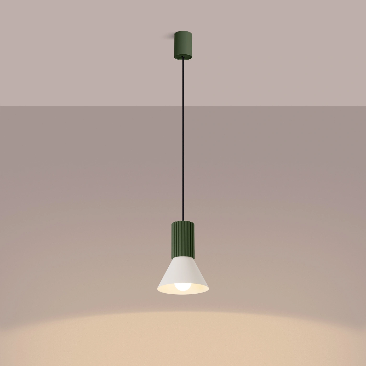 ESTRIA 1 zachwyca industrialnym stylem, który podkreślają proste linie i surowe wykończenie metalu. Połączenie beżowego klosza z zieloną oliwką podsufitki to nietuzinkowy duet kolorystyczny, wprowadzający świeżość i nowoczesność do każdego wnętrza. Tego typu lampa wisząca świetnie sprawdzi się zarówno jako pojedynczy akcent nad kuchenną wyspą, jak i w szeregu kilku egzemplarzy nad długim stołem w jadalni.