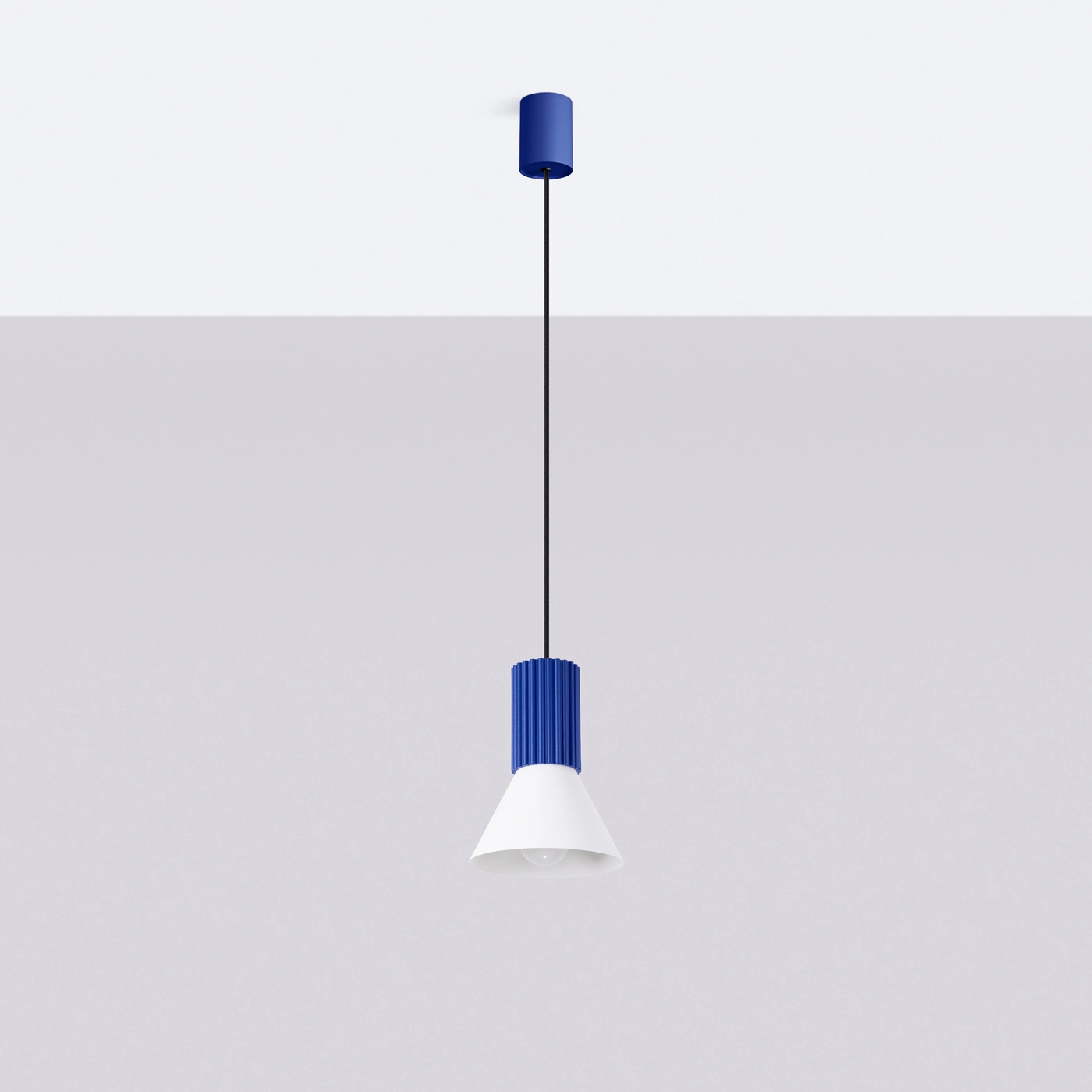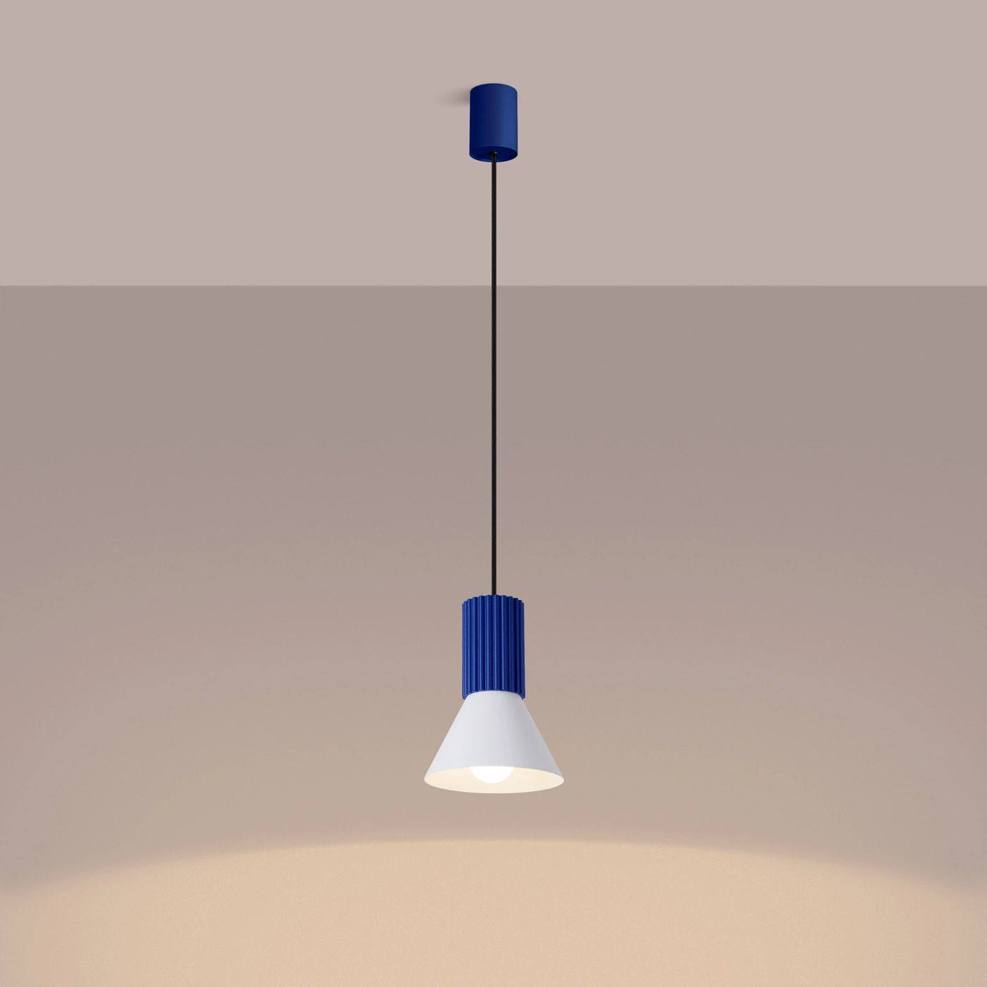 Lampa wisząca loftowa ESTRIA 1 marki SOLLUX LIGHTING to nowoczesne oświetlenie sufitowe o wysokości 120 cm, wykonane ze stali oraz aluminium. Połączenie matowej bieli z głęboką ultramaryną sprawia, że jest to wyjątkowo stylowa propozycja do kuchni i jadalni. Dzięki pojedynczemu punktowi światła z oprawą E14 doskonale sprawdzi się jako lampa nad stół, podkreślając industrialny charakter wnętrza.