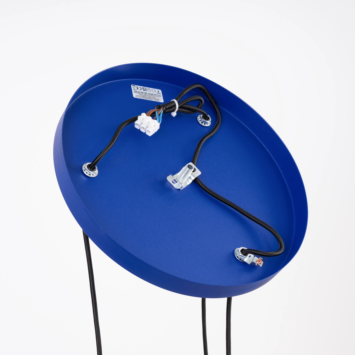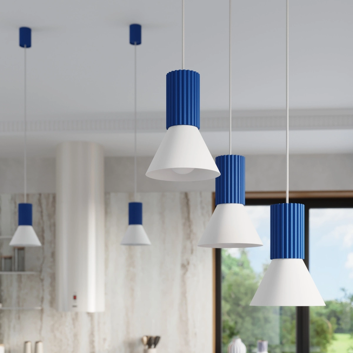 Wyrazista forma lampy wiszącej ESTRIA 3P podkreśla loftowy charakter wnętrza, wprowadzając do niego odrobinę nowoczesności i artystycznej swobody. Białe aluminiowe klosze, zawieszone na czarnym kablu, pięknie kontrastują z granatową podsufitką, tworząc spójną kompozycję kolorystyczną. Taki design doskonale wpisuje się zarówno w aranżacje minimalistyczne, jak i te inspirowane stylem industrialnym, dodając pomieszczeniu wyjątkowego charakteru.