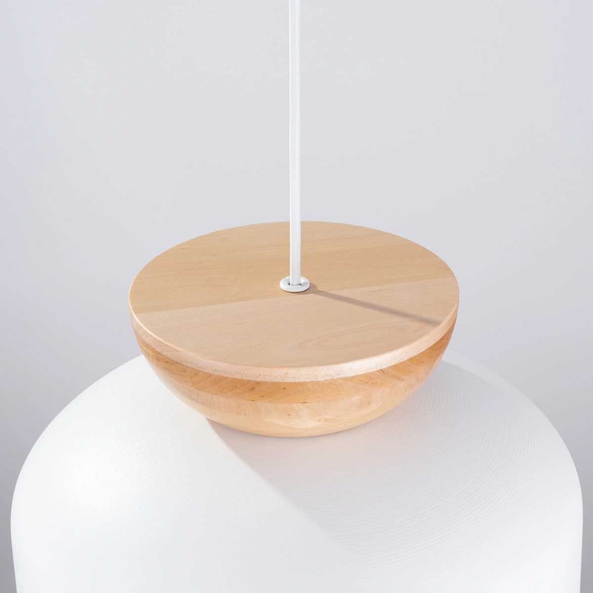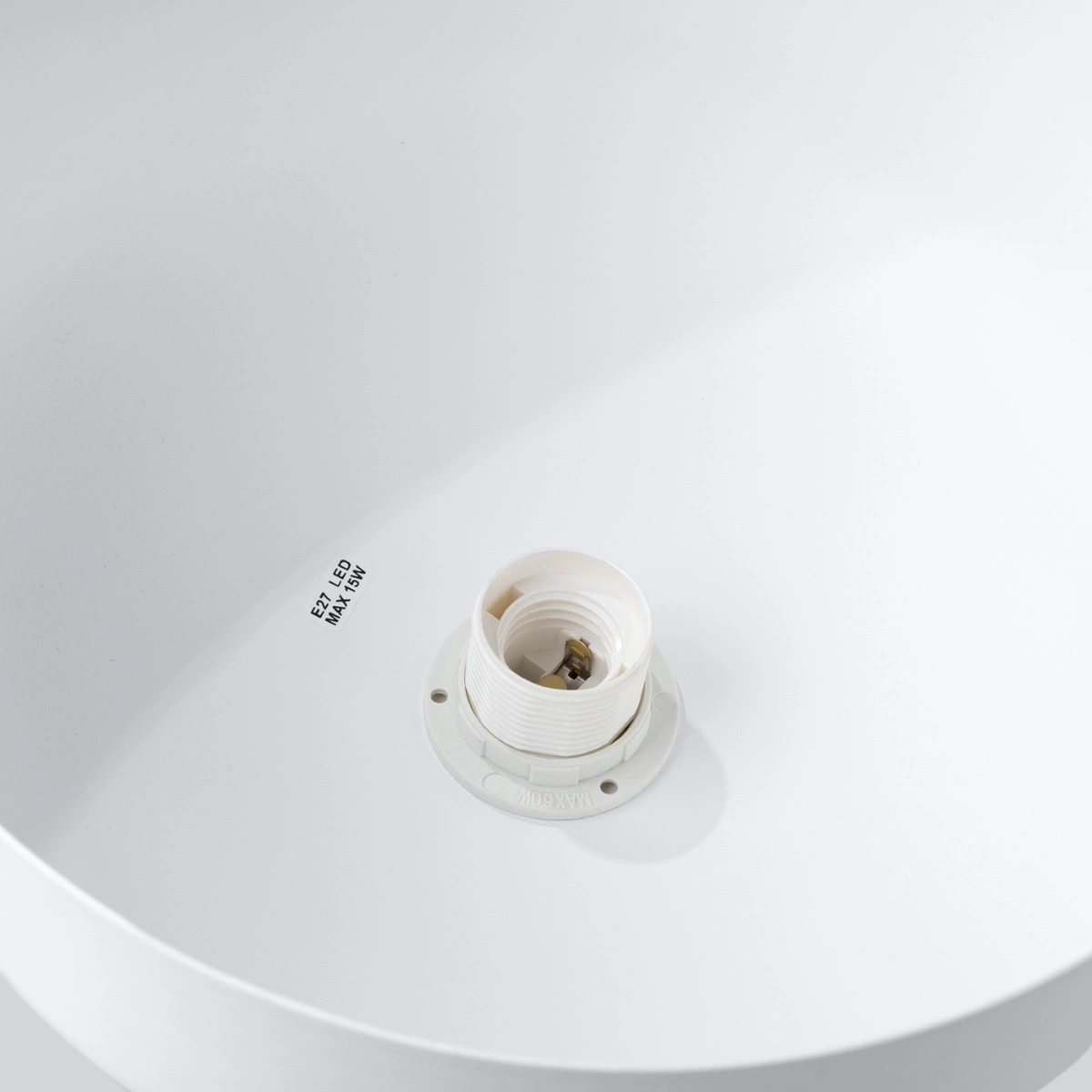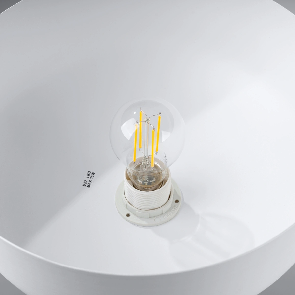 - Okrągły, biały klosz – równomiernie rozprasza światło, tworząc przyjemną atmosferę w całym pomieszczeniu.