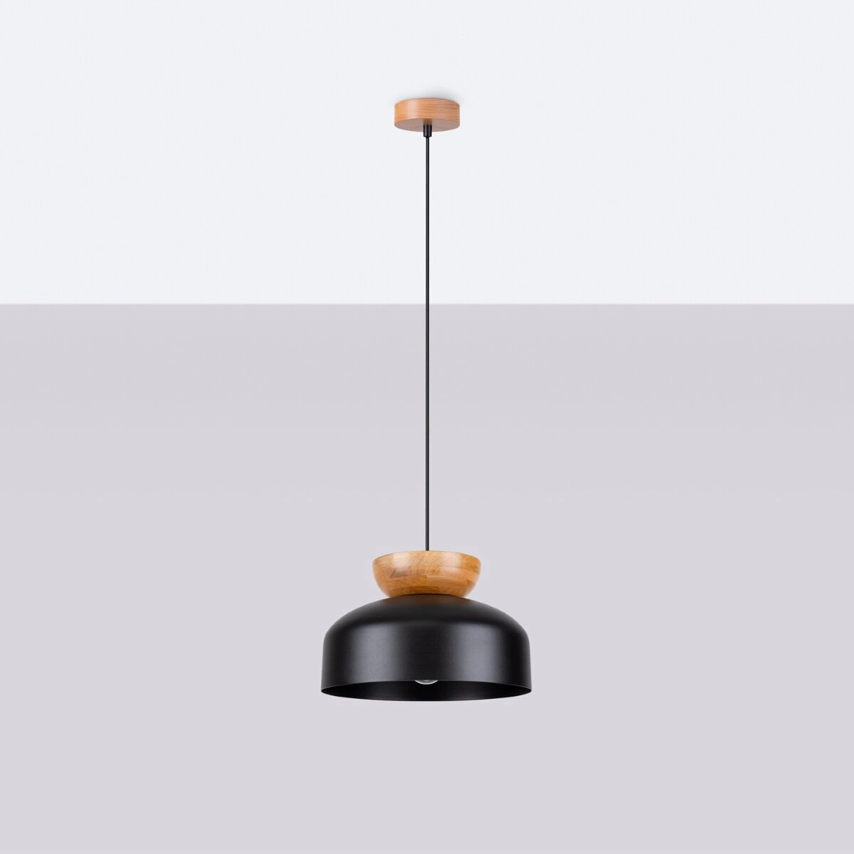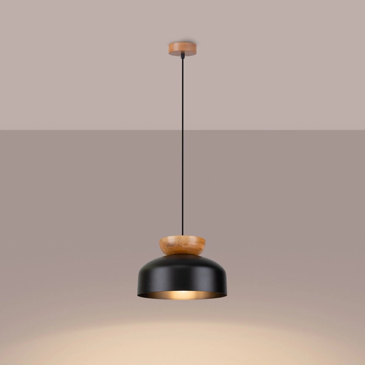 - Lampa wisząca MARION czarna to połączenie nowoczesnego designu z naturalnymi akcentami drewna.