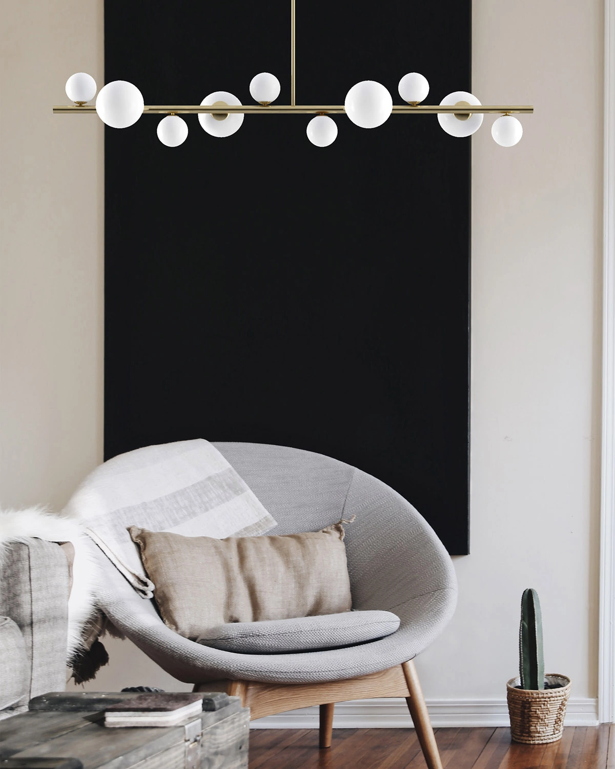 Minimalistyczna forma wykończona w kolorze szczotkowanego złota z dodatkiem szklanych mlecznych kloszy.