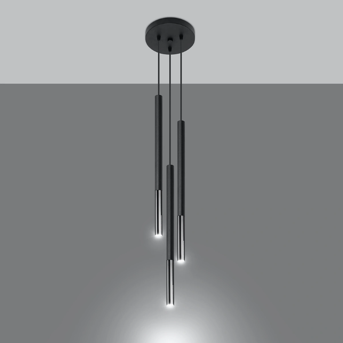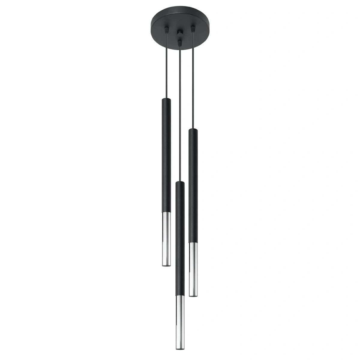 Lampa wisząca Mozaica 3-punktowa marki SOLLUX LIGHTING to nowoczesne oświetlenie sufitowe wykonane z metalu w wykończeniu czarnym i chromowanym. Model o wysokości 90 cm oraz szerokości 20 cm doskonale sprawdzi się jako lampa nad wyspę kuchenną, nad stół w jadalni lub jako żyrandol do salonu. Trzy źródła światła pozwalają na równomierne oświetlenie przestrzeni, podkreślając modernistyczny charakter wnętrza.