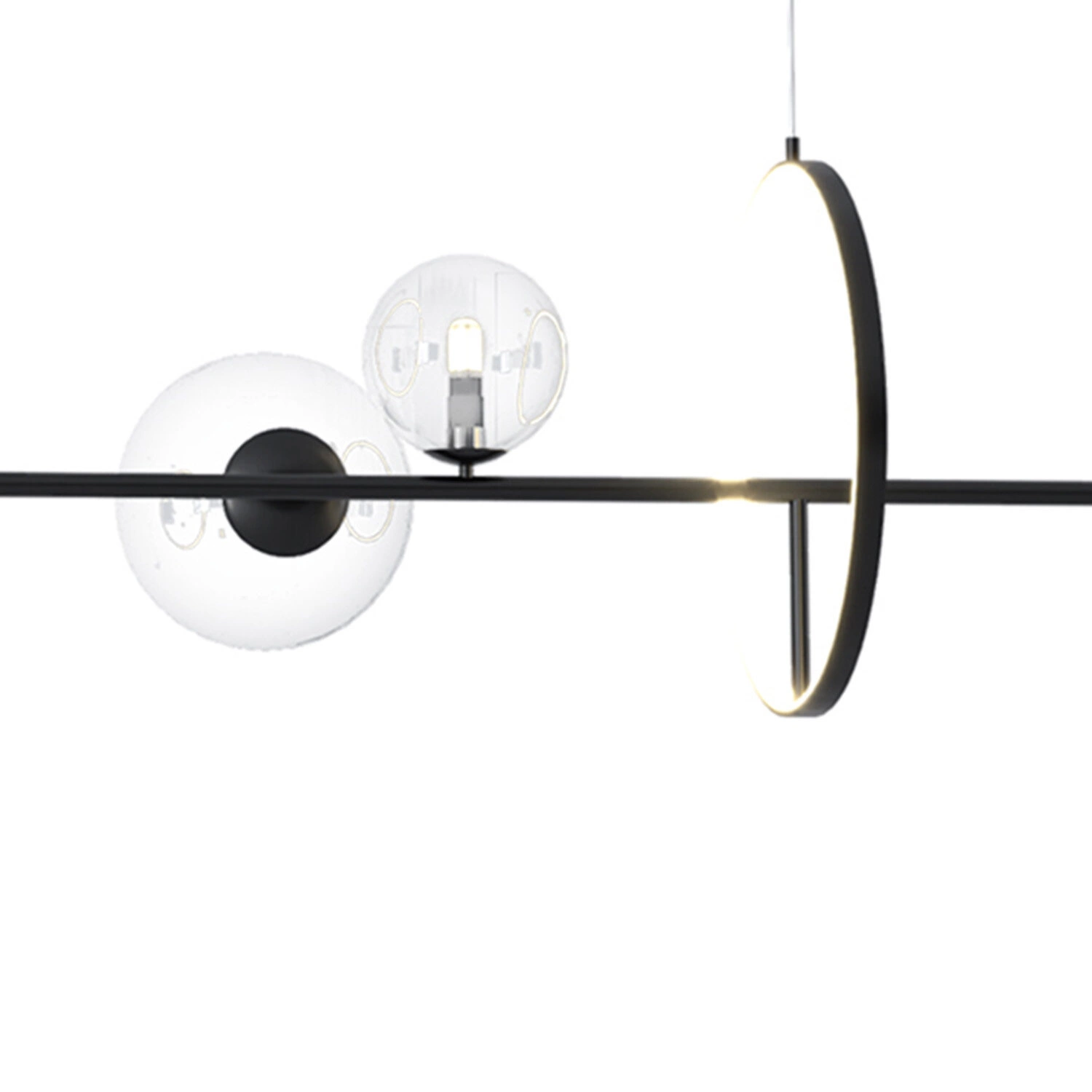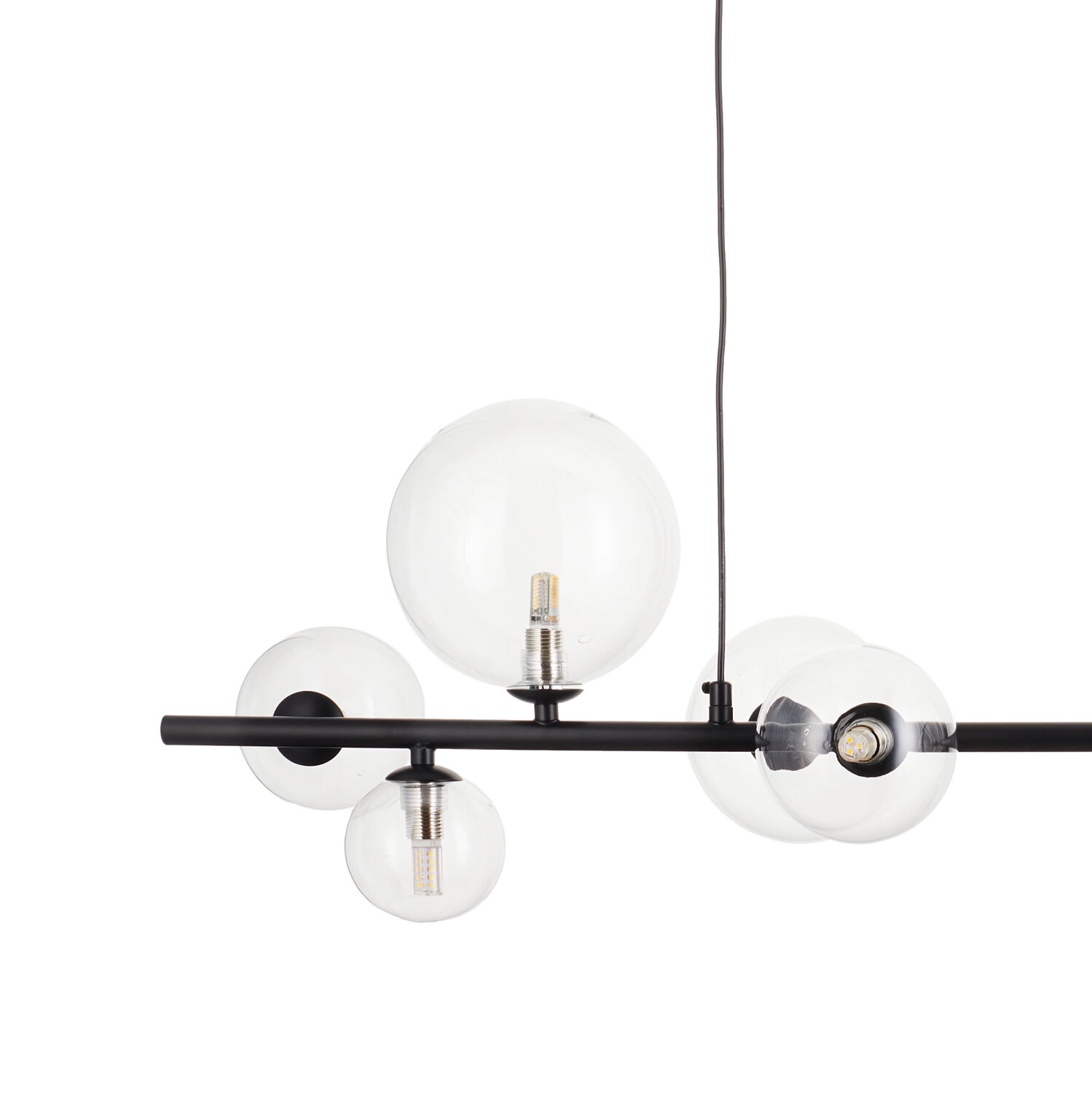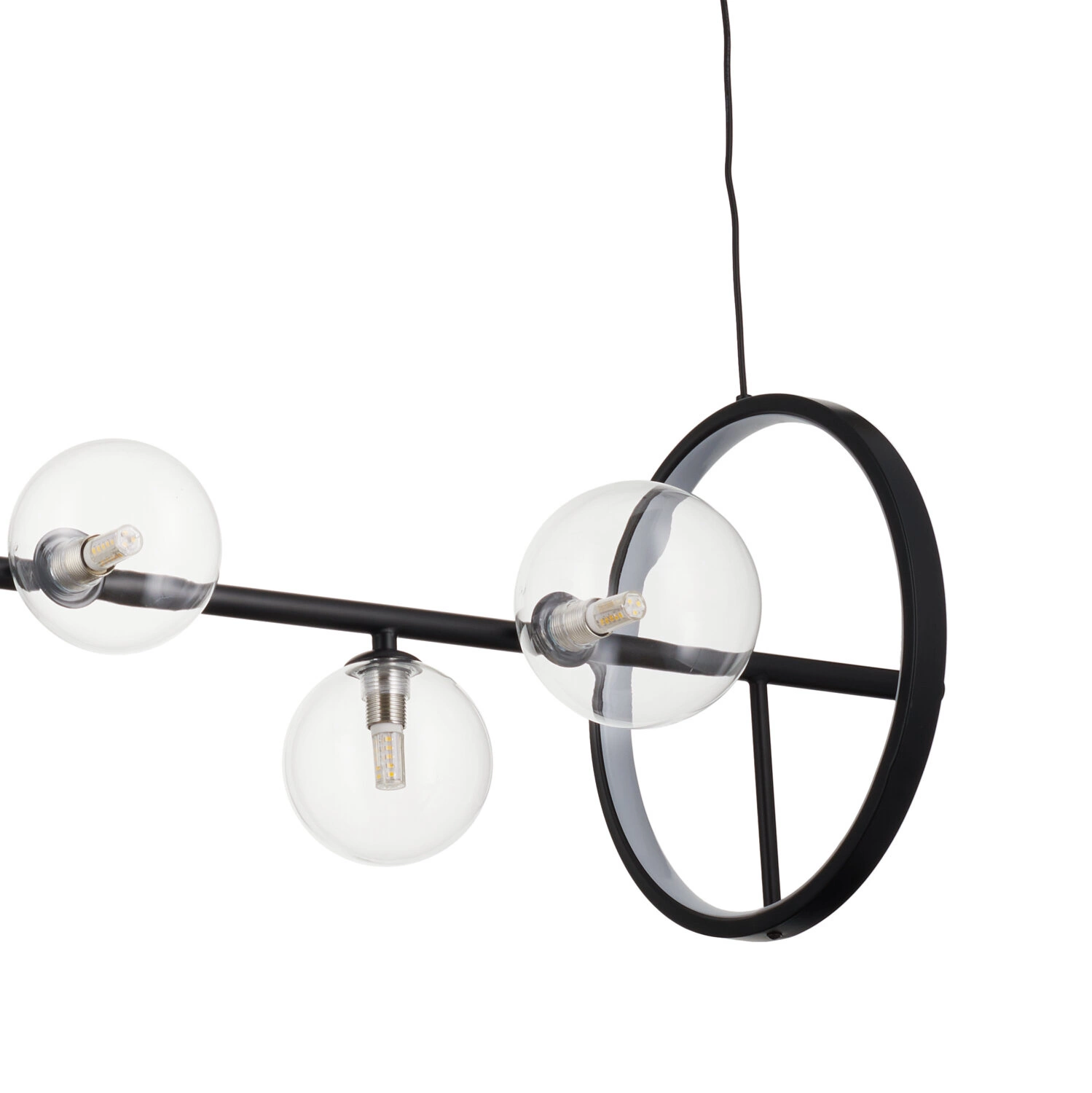 ORION LONG-90 to lampa wisząca kula, która przyciąga wzrok geometryczną linią oraz rozmieszczeniem szklanych kloszy o różnych średnicach (10, 12 i 15 cm). Jej design świetnie uzupełnia wnętrza utrzymane w eleganckim, nowoczesnym stylu glamour, dodając im lekkości i prestiżu. Efektowne wykończenie matową czernią nadaje lampie ponadczasowy charakter, a transparentne kule pięknie rozpraszają światło, tworząc nastrojowy klimat podczas wieczornych spotkań czy rodzinnych kolacji.