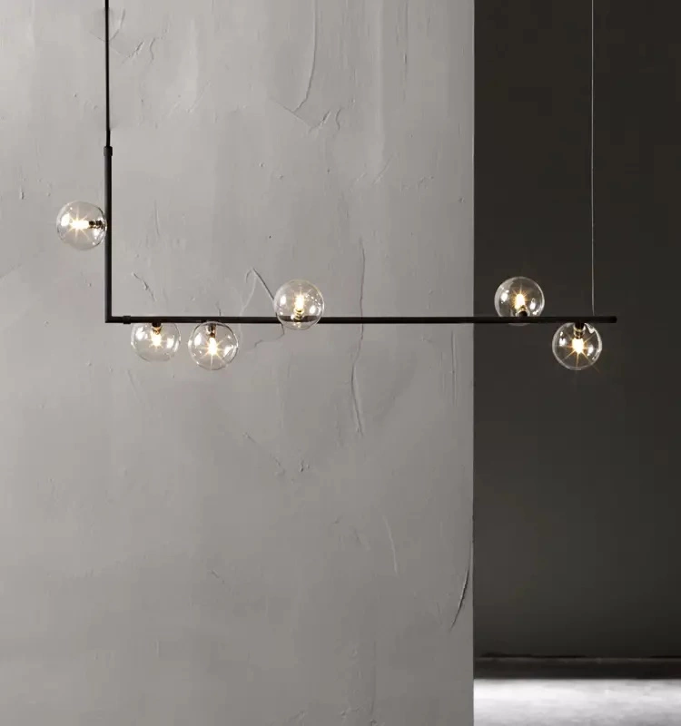 Minimalistyczna lampa SIMPLY w kształcie litery L zwieńczona jest sześcioma szklanymi kloszami.
