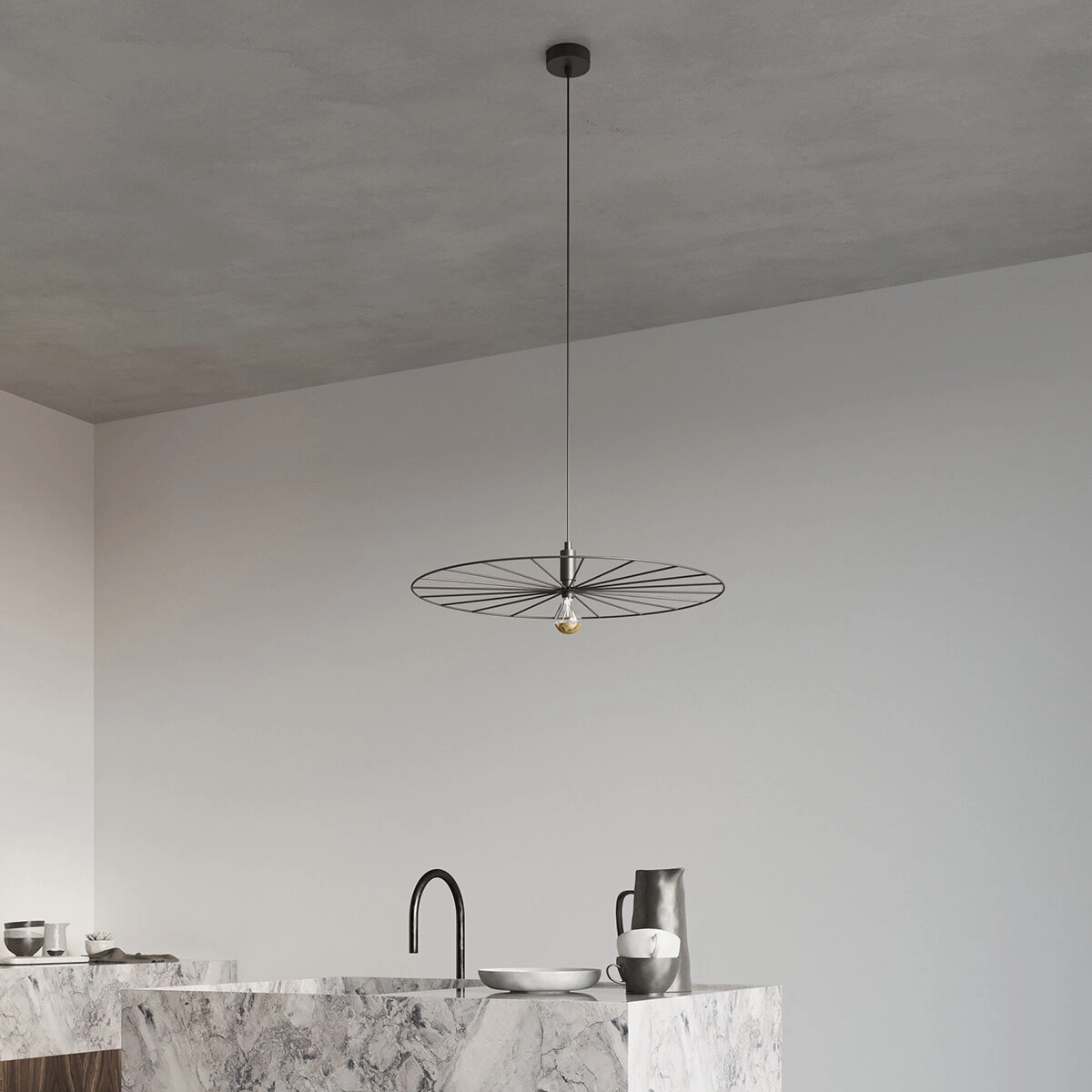 Lampa Sirkel o średnicy 30cm to metalowy abażur budową przypominający koło od wozu. Okrągły, płaski abażur z cienkimi czarnymi przęsłami wykonany został z metalu malowanego proszkowo na czarno.