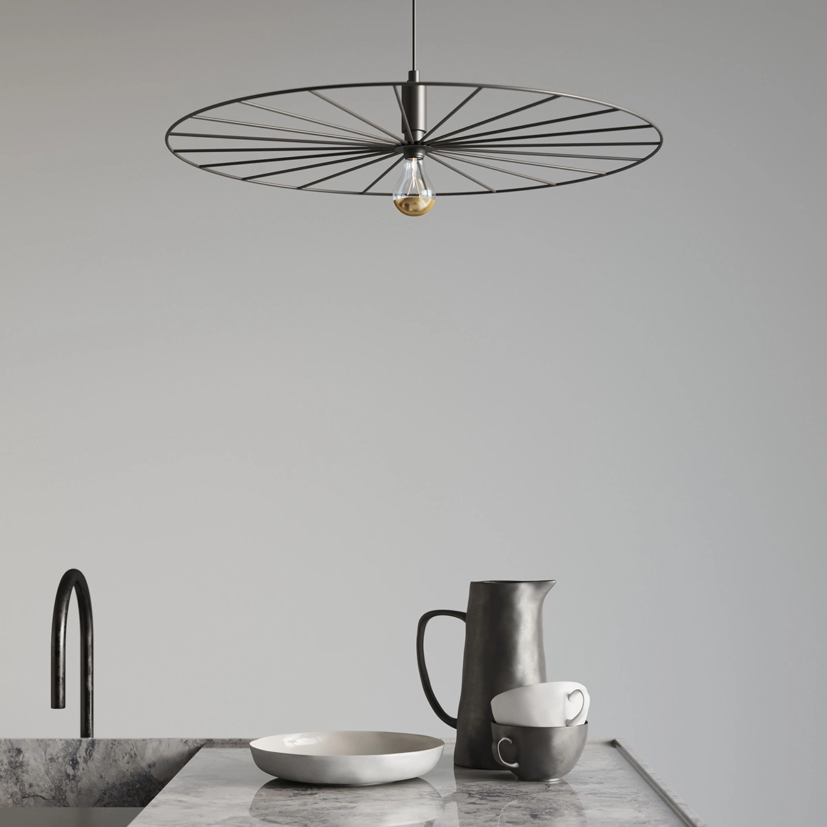 Lampa Sirkel o średnicy 60cm to metalowy abażur budową przypominający koło od wozu. Okrągły, płaski abażur z cienkimi czarnymi przęsłami wykonany został z metalu malowanego proszkowo na czarno.