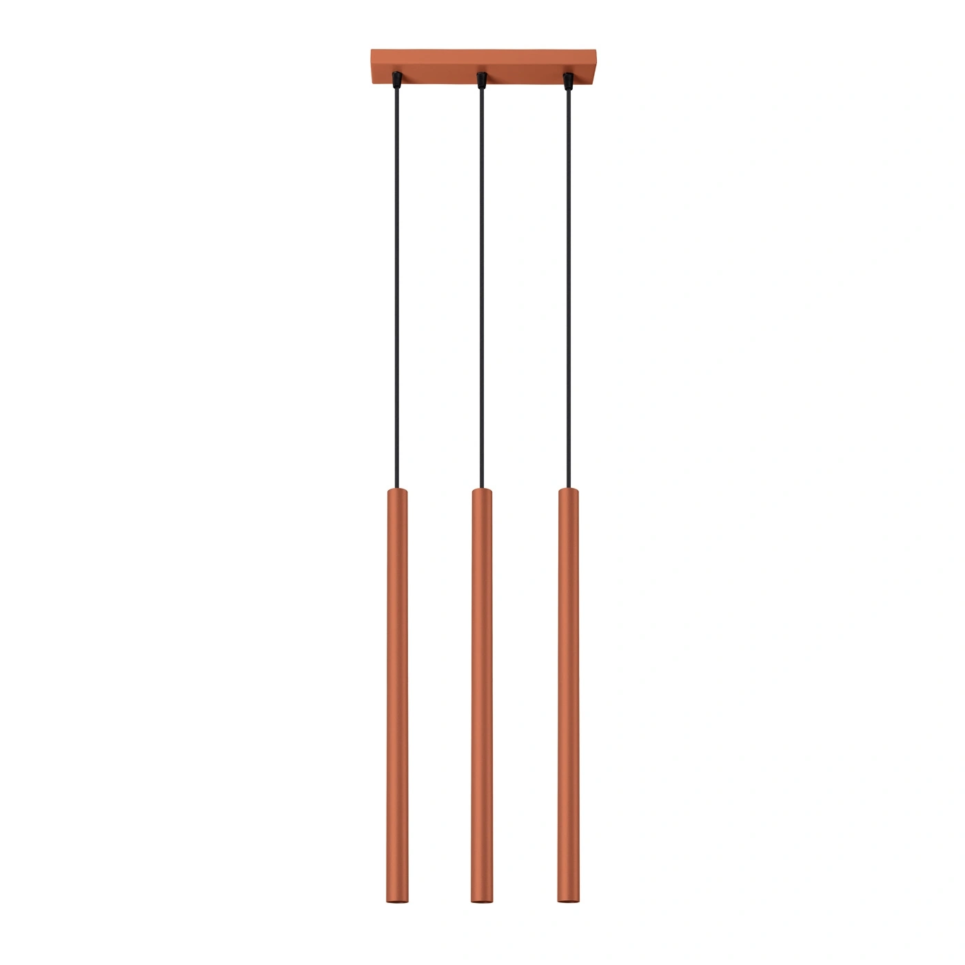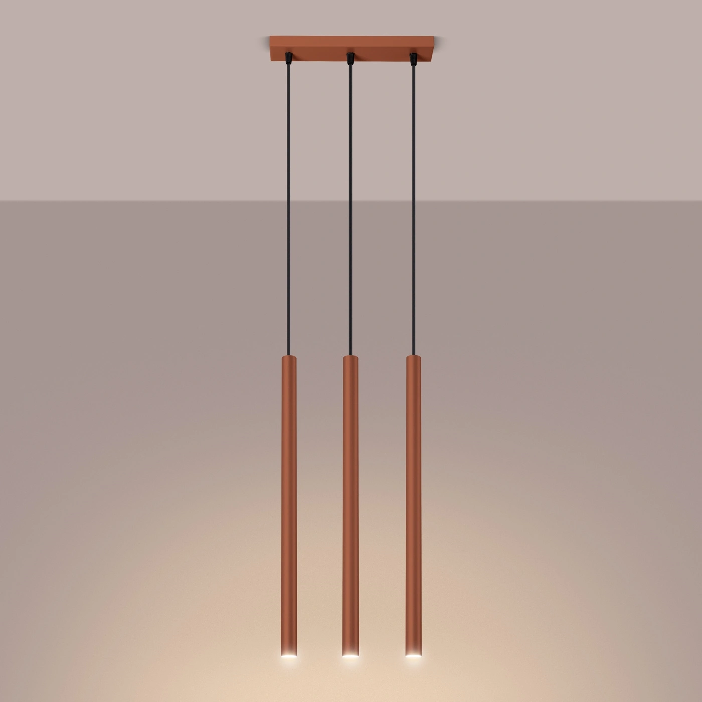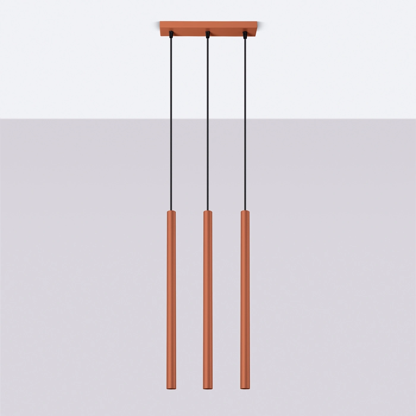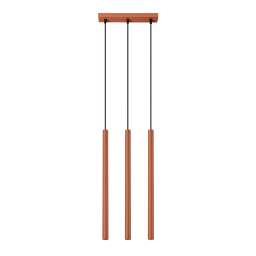 Lampa wisząca sufitowa Pastelo 3 marki SOLLUX LIGHTING to nowoczesne oświetlenie wykonane z trwałej stali w wyrazistym, ochrowo-czerwonym kolorze. Model ten wyróżnia się trzema liniowymi kloszami o regulowanej wysokości zawieszenia, co pozwala idealnie dopasować lampę do salonu, jadalni czy nad wyspę kuchenną. Dzięki smukłej formie (szerokość 5 cm, długość 30 cm, maksymalna wysokość 94 cm) lampa doskonale sprawdzi się zarówno w przestronnych, jak i mniejszych wnętrzach, zapewniając stylowe i równomierne oświetlenie.