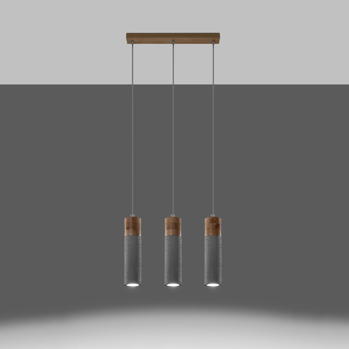 Lampa wisząca ZANE 3 marki Sollux Lighting to nowoczesna propozycja oświetlenia, która łączy w sobie surowy charakter betonu z ciepłem naturalnego drewna. Zestaw trzech smukłych tub w szarym kolorze, zawieszonych na długości do 120 cm, doskonale sprawdzi się jako lampa nad stół w jadalni, wyspę kuchenną lub centralny punkt w salonie. Minimalistyczny design oraz szerokość 45 cm sprawiają, że żyrandol ZANE 3 nie przytłacza przestrzeni, a jednocześnie przyciąga wzrok swoją oryginalnością.