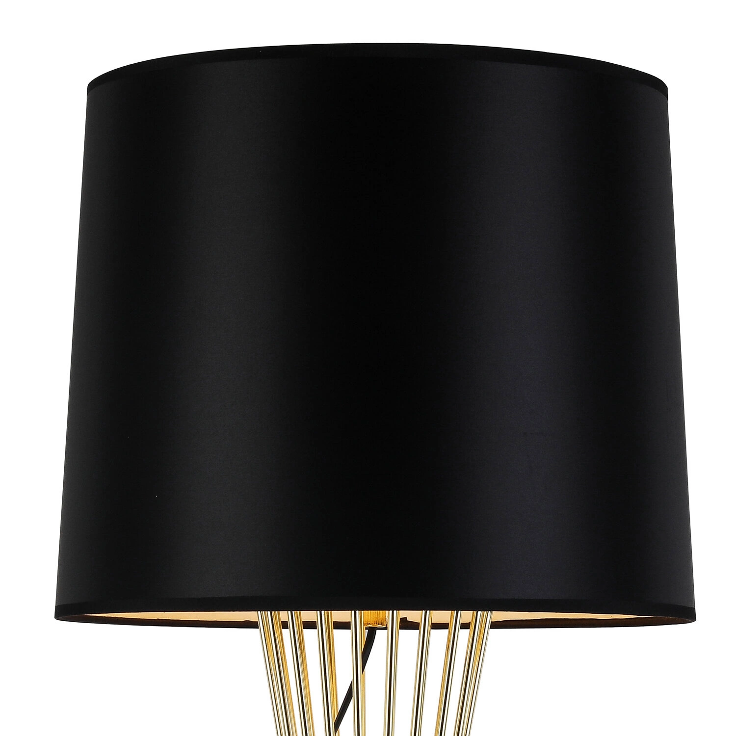 Czarny abażur wykonano z satynowej tkaniny wykończonej czarną lamówką.