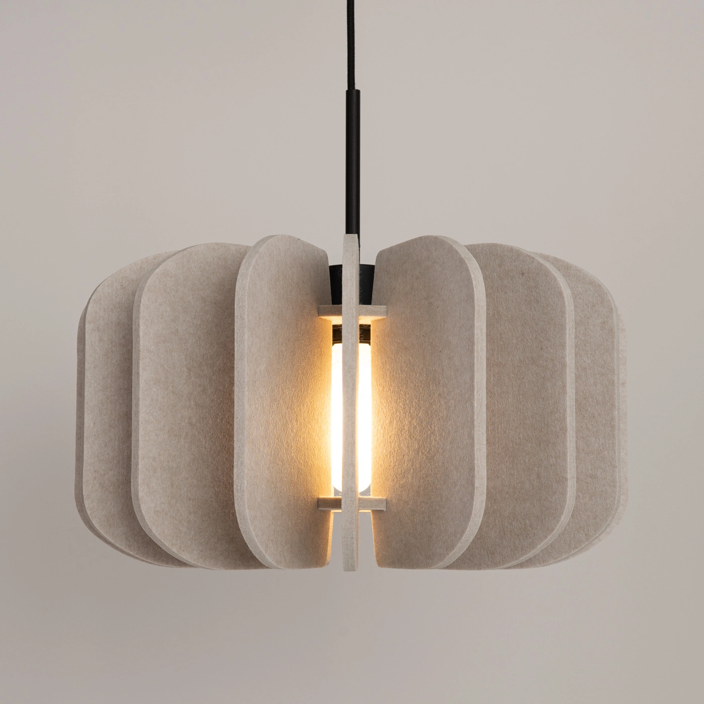 - Beżowy klosz z filcu – nadaje wnętrzu przytulności, a jednocześnie rozprasza światło w delikatny sposób