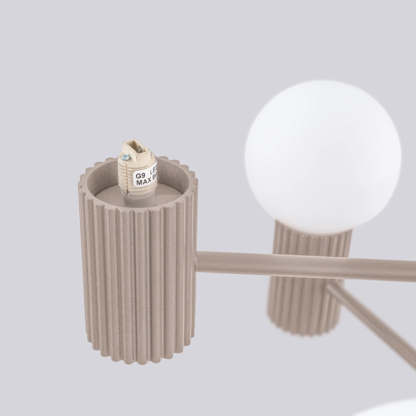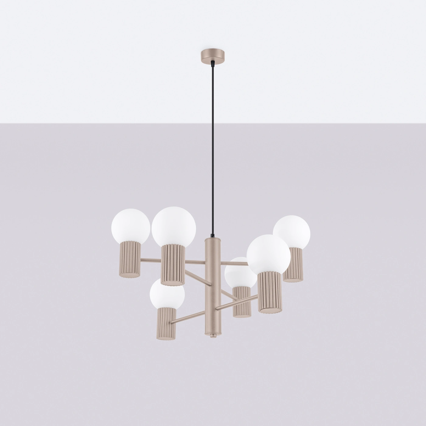 Żyrandol HALO 6 beżowy to rozwiązanie, które pozwoli odmienić charakter każdego wnętrza. Jego nowoczesny design przyciąga wzrok dzięki subtelnemu połączeniu matowego beżu z mlecznobiałymi, kulistymi kloszami. Zastosowanie wysokiej jakości szkła w kloszach gwarantuje równomierne, przyjemne dla oka rozproszenie światła, dzięki czemu przestrzeń staje się przytulna i sprzyja wypoczynkowi. Taki żyrandol do salonu świetnie sprawdzi się nad dużym stołem lub w centrum jadalni, podkreślając nowoczesny styl aranżacji.