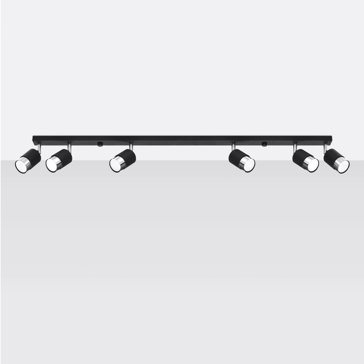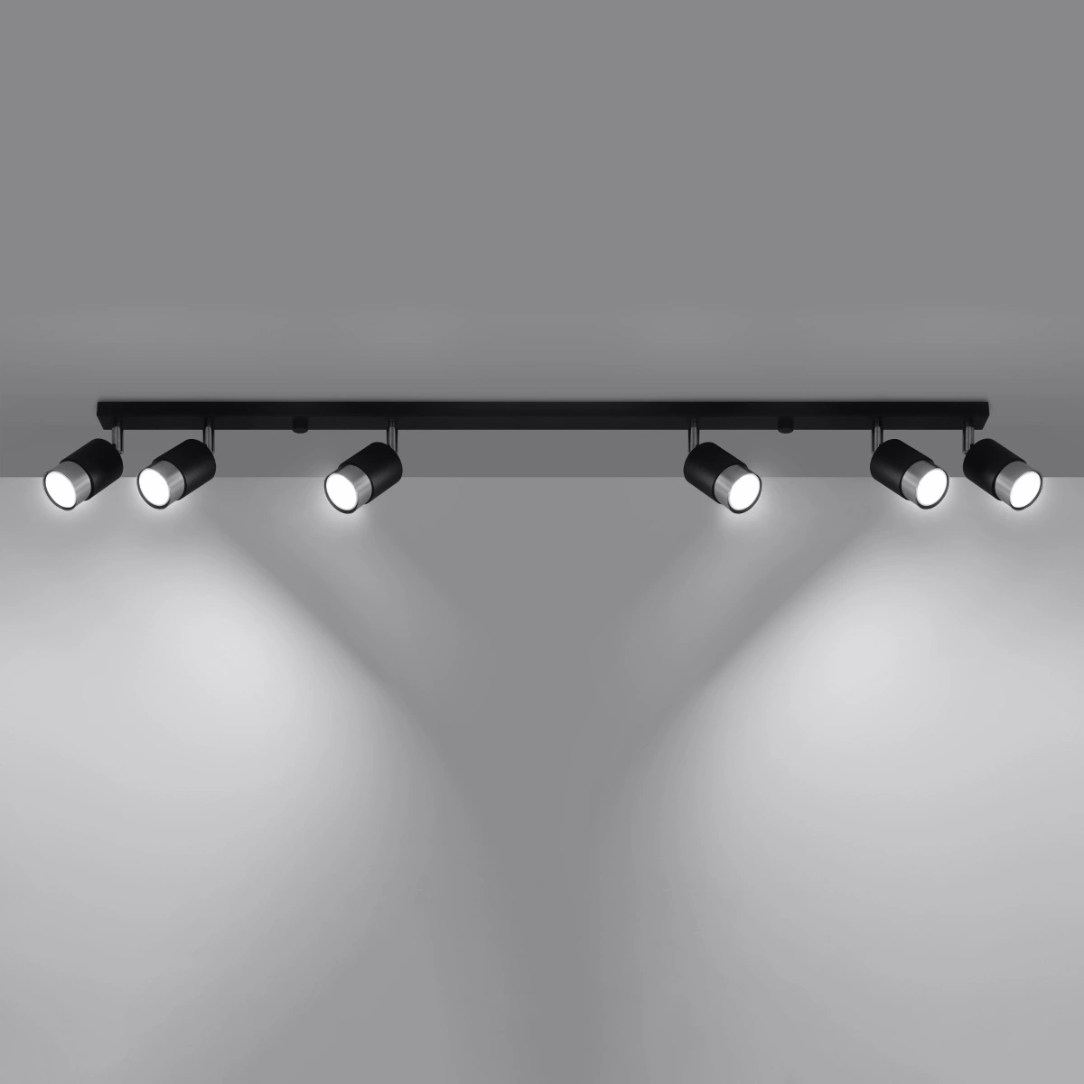 Plafon sufitowy NERO 6 czarny chrom marki Sollux to nowoczesna lampa natynkowa, która perfekcyjnie wpisuje się w industrialny i loftowy styl wnętrz. Wykonana ze stali, o długości 117 cm i wysokości 18 cm, łączy głęboką czerń z eleganckimi, chromowanymi detalami. Sześć ruchomych opraw GU10 pozwala precyzyjnie skierować światło, zapewniając funkcjonalne oświetlenie do salonu, kuchni lub sypialni.