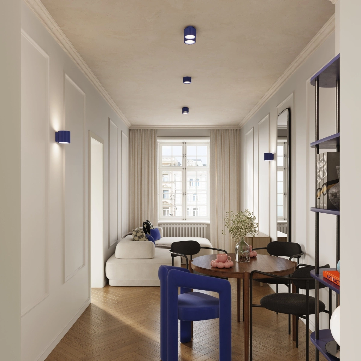 Jeśli szukasz oświetlenia, które łączy funkcjonalność z wyrazistą estetyką, plafon AURA 2 niebieski będzie doskonałym wyborem. Głęboki, niebieski kolor oprawy wprowadza do wnętrza odrobinę ekspresji, jednocześnie pozostając na tyle uniwersalnym, by harmonijnie komponować się z jasnymi, stonowanymi barwami oraz naturalnymi materiałami. Minimalistyczny kształt i ryflowana powierzchnia podkreślają nowoczesny styl i nadają całości lekkości, dzięki czemu plafon nie przytłacza nawet niewielkich przestrzeni.