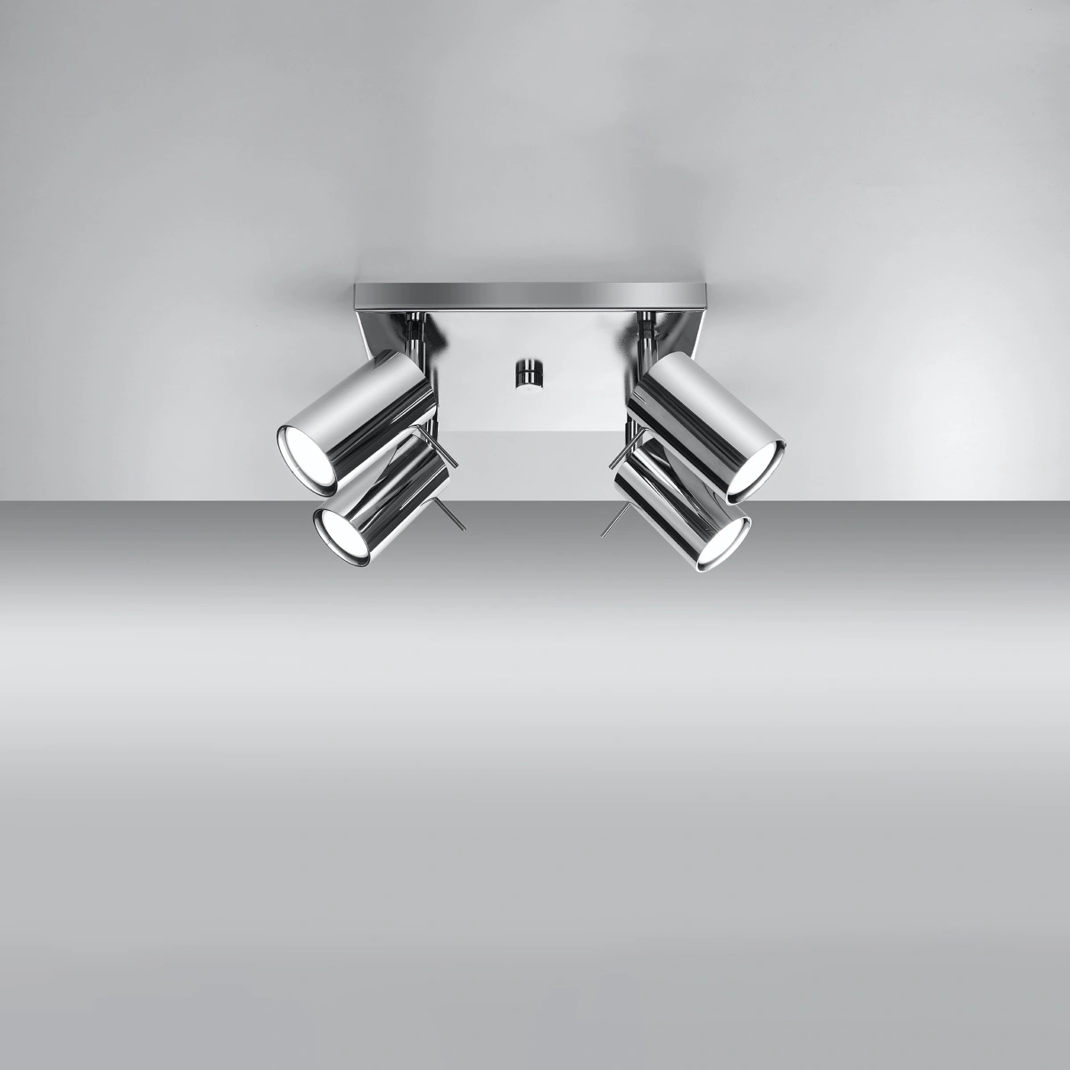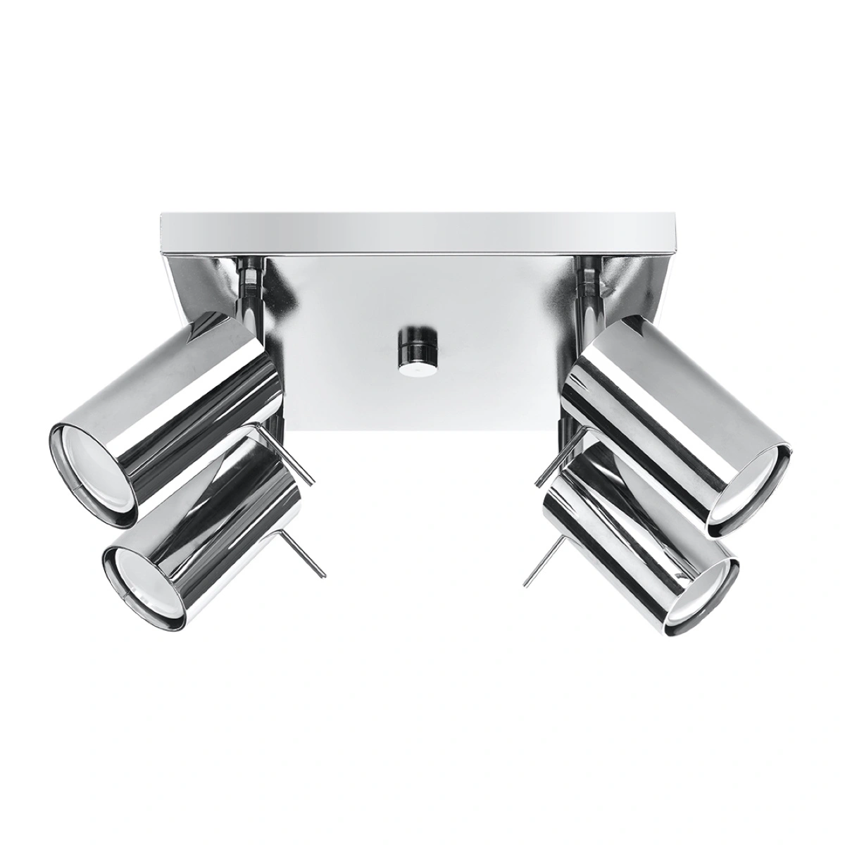 Plafon sufitowy RING 4 chrom marki Sollux Lighting to nowoczesna lampa wykonana z trwałej stali, zaprojektowana z myślą o funkcjonalnym oświetleniu salonu, kuchni lub sypialni. Kwadratowa podstawa o wymiarach 25×25 cm mieści cztery regulowane oprawy na żarówki GU10, pozwalając swobodnie kierować światło dokładnie tam, gdzie go potrzebujesz. Chromowane wykończenie nadaje całości industrialny charakter, który świetnie wpisuje się w nowoczesne aranżacje wnętrz.
