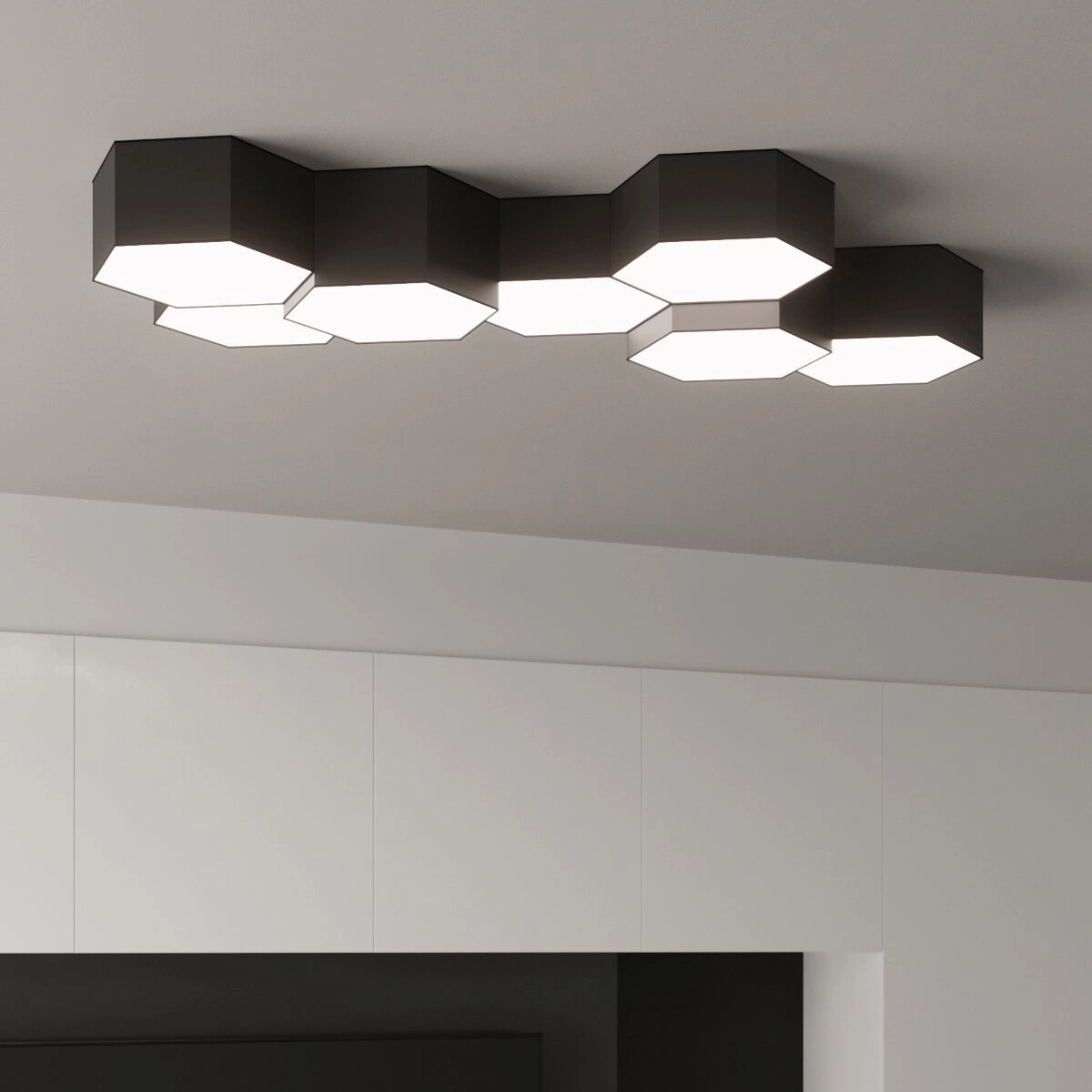 Plafony z kolekcji Sunde dostępne są w 2 klasycznych wersjach kolorystycznych: białej i czarnej, a także w 3 różnych rozmiarach. Dzięki temu z łatwością znajdziesz idealny model do swojego wnętrza. Wykorzystując kilka tych samych lub różnych modeli lampy, możesz stworzyć kreatywne kompozycje oświetleniowe. Geometryczny kształt heksagonu o jednolitej długości ścianki bocznej zintegrujesz w większe grupy, budując nowoczesną lampę sufitową o niepowtarzalnej formie.