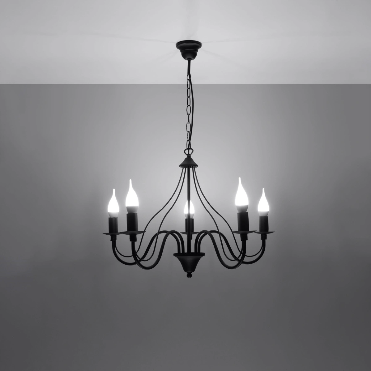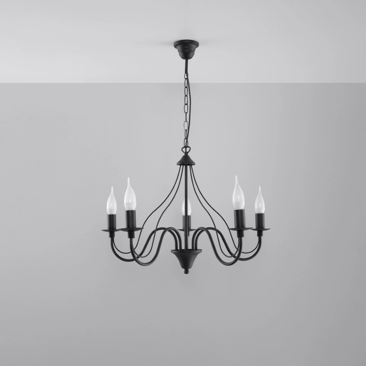 Żyrandol do salonu Minerwa marki Sollux Lighting to nowoczesna, 5-punktowa lampa sufitowa wykonana z solidnego metalu w głębokim odcieniu czerni. Dzięki imponującym wymiarom – wysokość 80 cm, szerokość 60 cm – oraz pięciu źródłom światła, doskonale doświetli nawet duże przestrzenie, stając się wyrazistym akcentem aranżacji. Połączenie eleganckiej formy z trwałością materiałów czyni ten żyrandol nie tylko praktycznym, ale także stylowym wyborem do salonu, jadalni czy nad stół w kuchni.