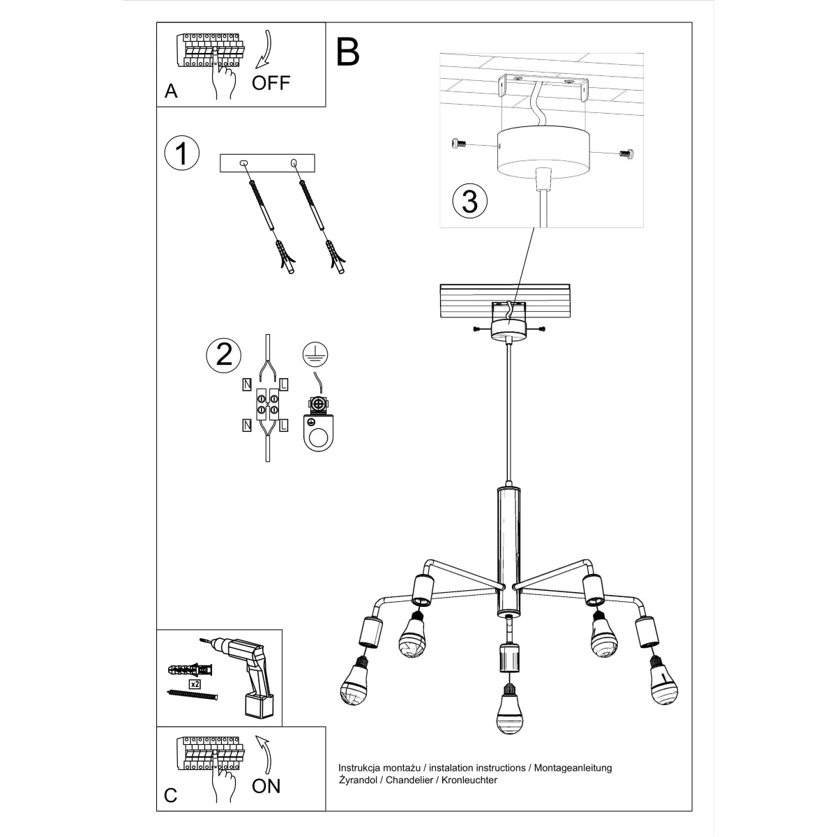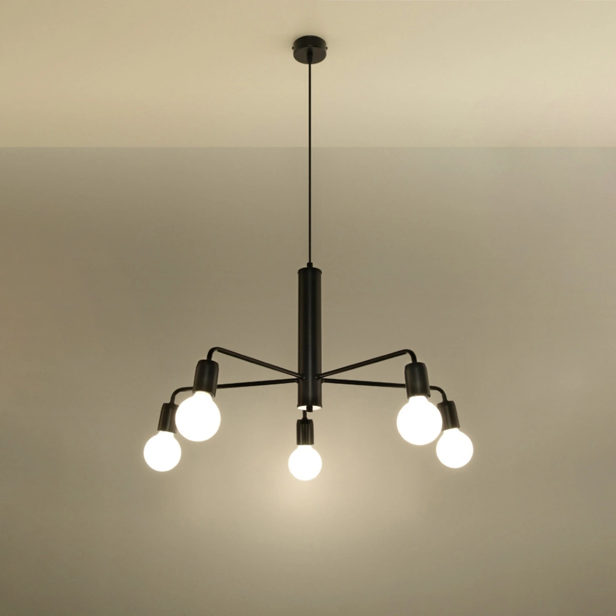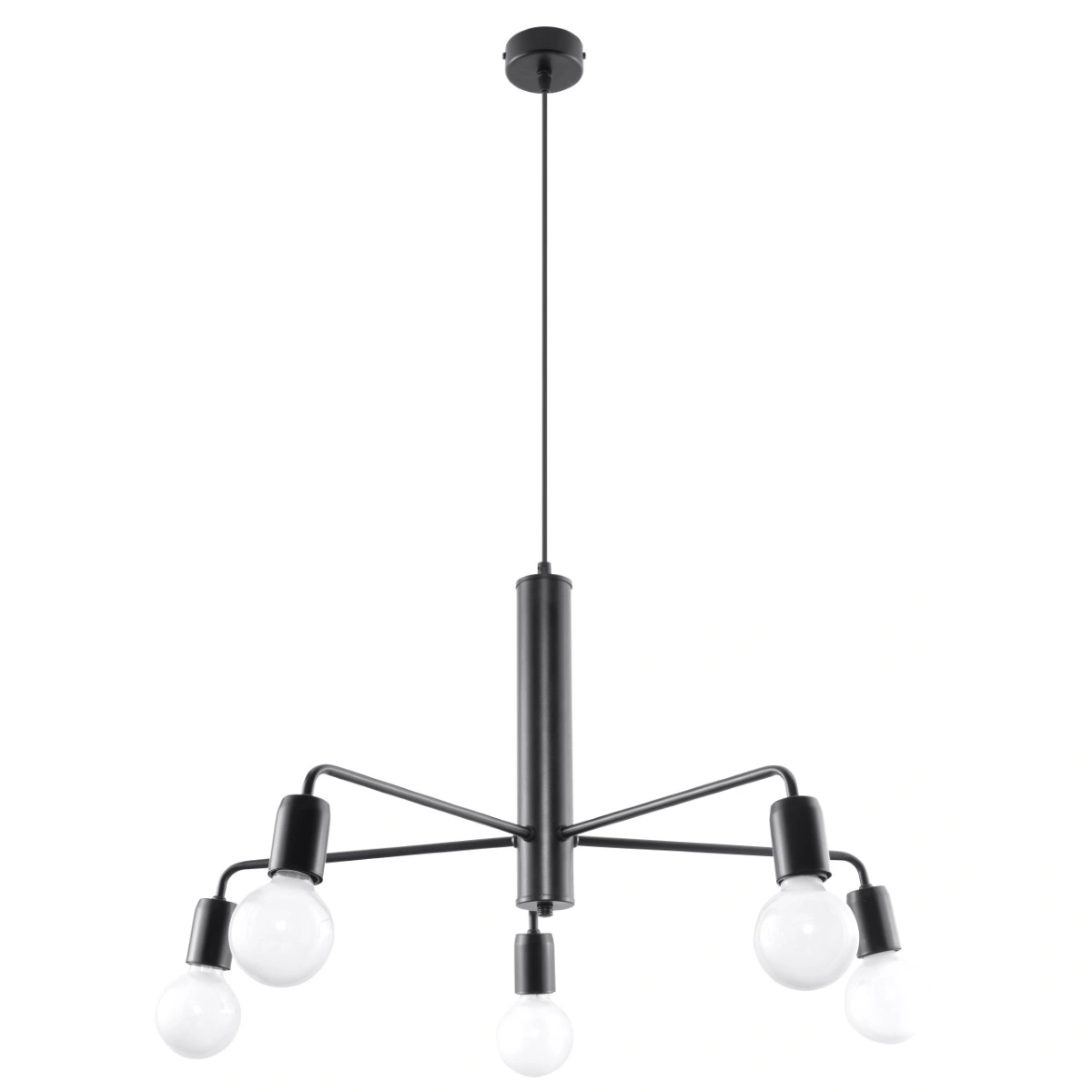 Żyrandol nowoczesny DUOMO 5 czarny marki Sollux Lighting to wyraziste oświetlenie sufitowe, które z łatwością podkreśli charakter Twojego wnętrza. Wykonany ze stali, o imponującej szerokości 60 cm i wysokości 85 cm, żyrandol ten oferuje pięć źródeł światła na oprawki E27, zapewniając skuteczne i równomierne rozświetlenie salonu, jadalni lub sypialni. Minimalistyczna, industrialna forma w matowej czerni doskonale wpisuje się w nowoczesne aranżacje, dodając im elegancji i wyrazistości.