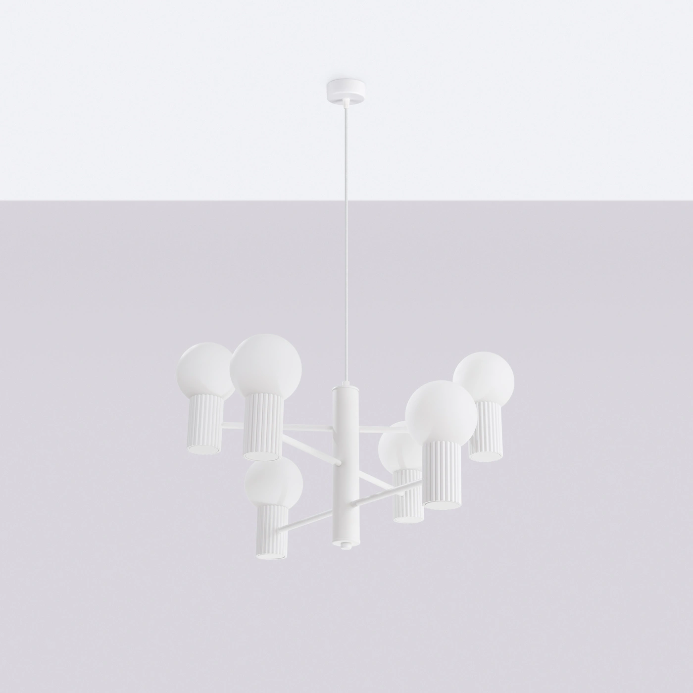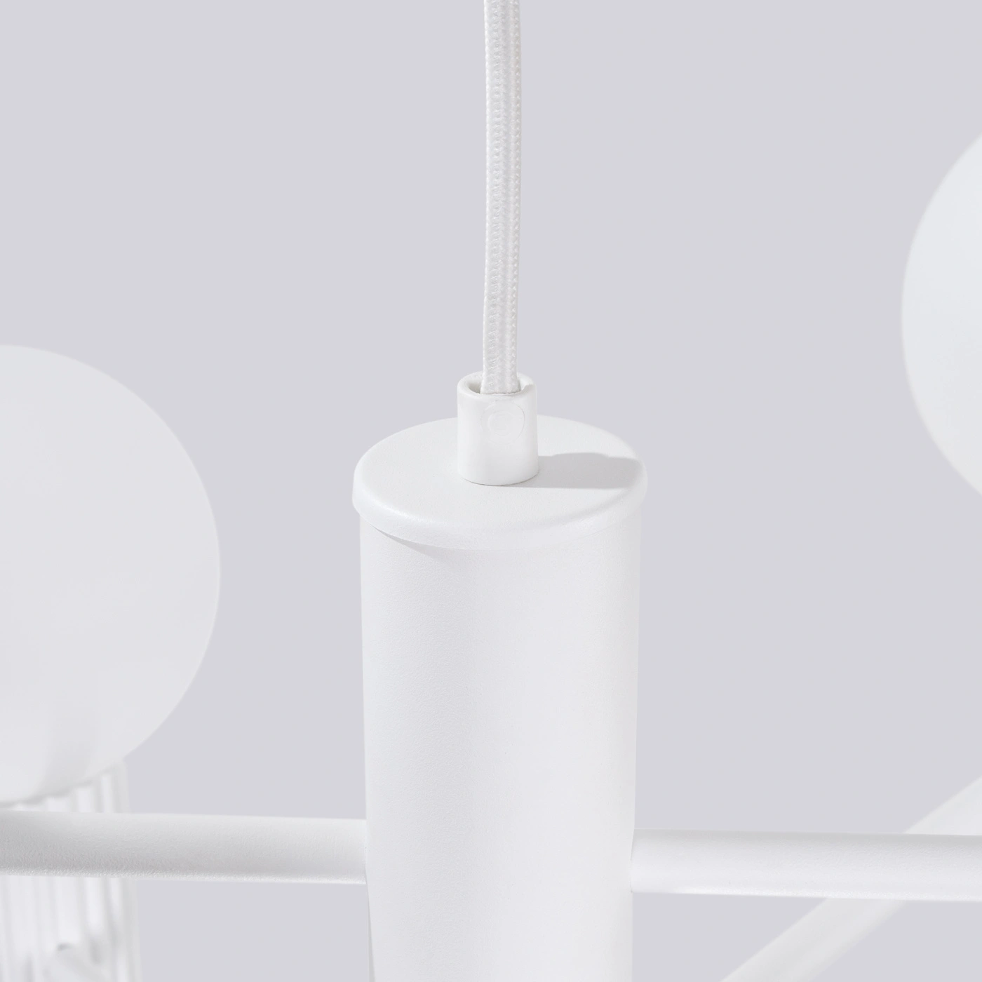 Lampa wisząca HALO 6 wyróżnia się przemyślaną konstrukcją i prostą elegancją. Połączenie białego, matowego wykończenia z kulistymi, szklanymi kloszami daje efekt lekkości, a jednocześnie stanowi mocny akcent dekoracyjny. Okrągłe elementy subtelnie rozpraszają światło, tworząc przyjemną atmosferę w każdym wnętrzu. Żyrandol świetnie wpisuje się w aranżacje nowoczesne, minimalistyczne i skandynawskie, podkreślając charakter przestrzeni bez nadmiernego przytłoczenia.