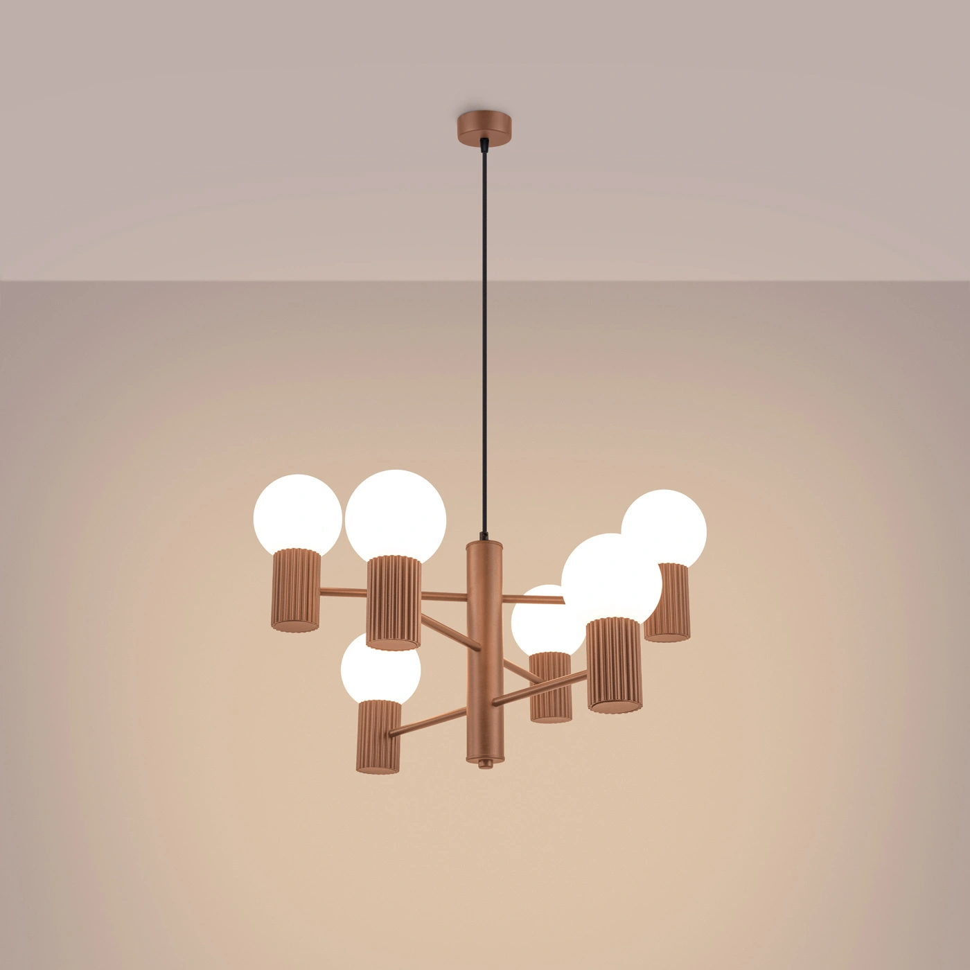 Sześć źródeł światła z oprawkami G9 umożliwia równomierne doświetlenie nawet dużych przestrzeni, co czyni ten model trafnym wyborem jako żyrandol do salonu, lampa nad stół w jadalni lub oświetlenie do kuchni. Przemyślana szerokość 64 cm pozwala uzyskać optymalny rozkład światła bez efektu oślepiania – idealnie sprawdzi się podczas rodzinnych spotkań czy wieczornego relaksu.