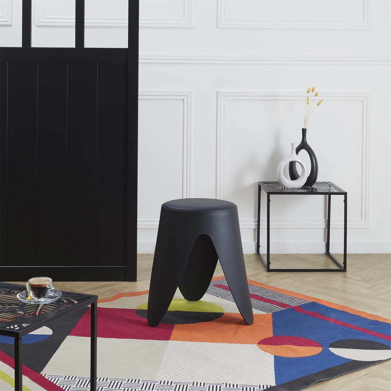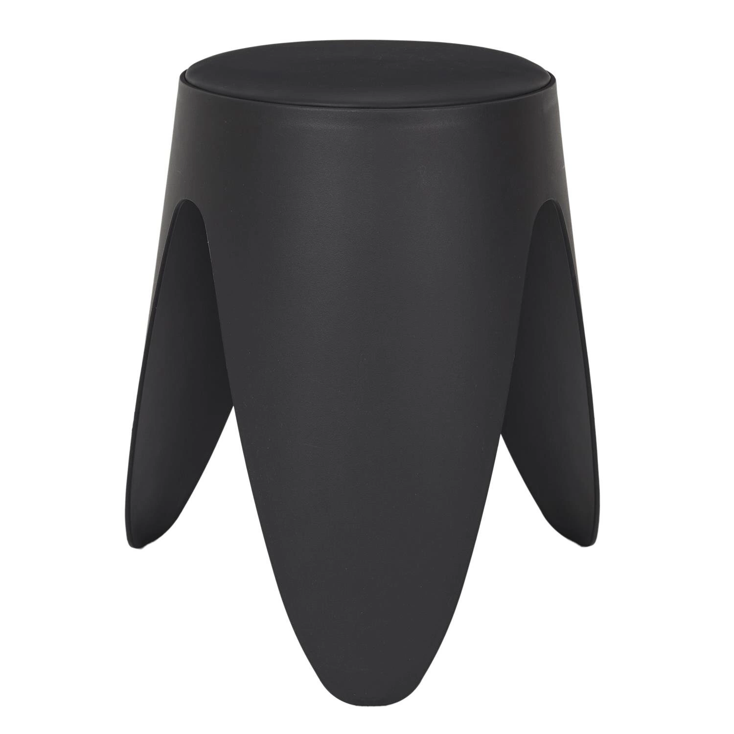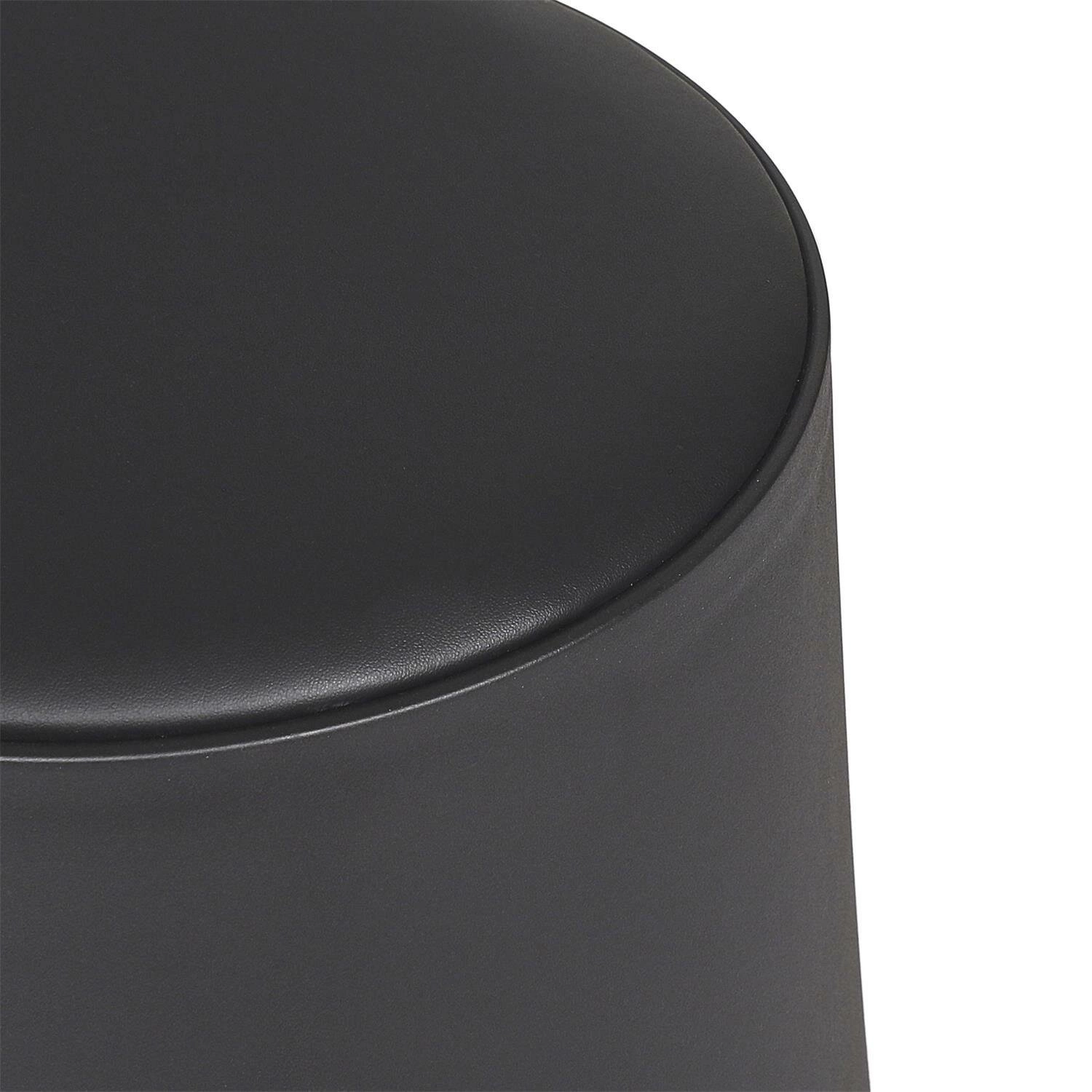 - Stołek Eve to elegancki, czarny stołek wykonany z tworzywa sztucznego, skóry ekologicznej i pianki tapicerskiej.