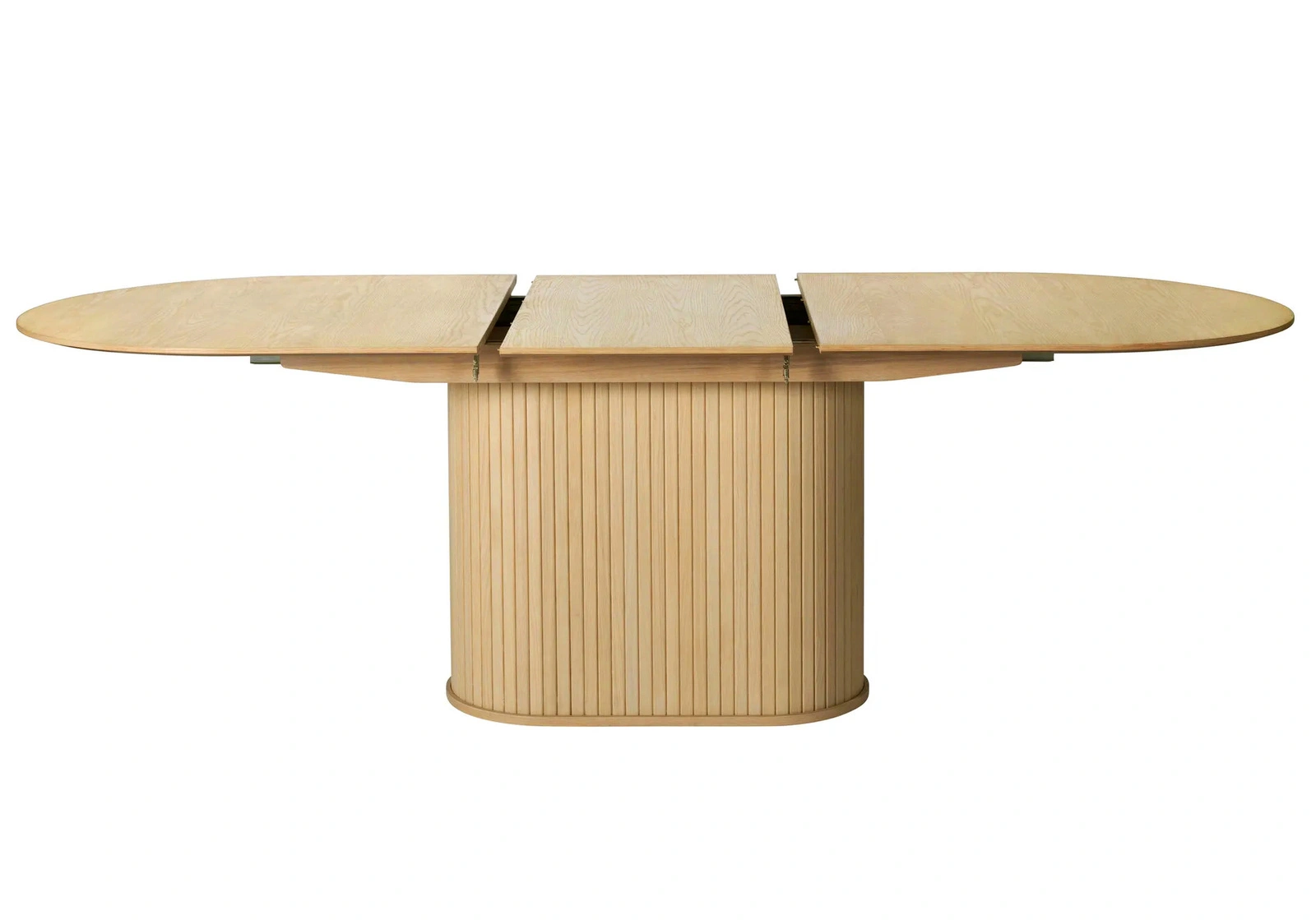 Stół rozkładany Lano marki UNIQUE Furniture to wyjątkowy mebel do jadalni, który łączy nowoczesny design z funkcjonalnością. Owalny blat o imponującej długości 230 cm wykonano z płyty MDF pokrytej okleiną w kolorze naturalnego dębu, a całość opiera się na solidnej pojedynczej nodze. Dzięki mechanizmowi rozkładania i dodatkowym blatom w zestawie, zyskujesz elastyczność i wygodę podczas organizowania rodzinnych spotkań czy przyjęć ze znajomymi.