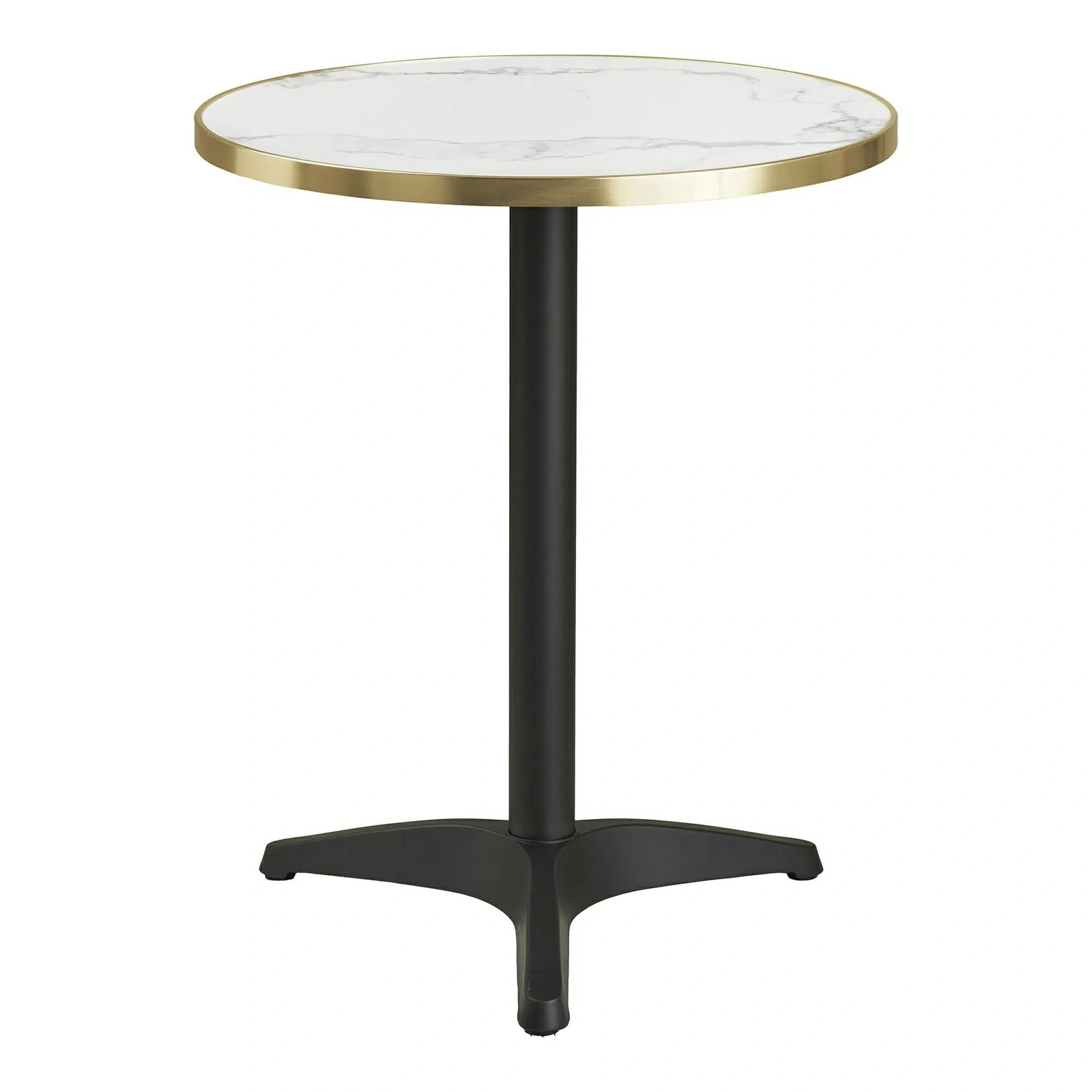 Stół bistro House Nordic to elegancki, okrągły stół do jadalni i kuchni o średnicy 60 cm, łączący blat w kolorze białego marmuru ze złotą krawędzią i czarną, metalową nogą. Smukła podstawa na jednej nodze oraz półmatowe wykończenie nadają mu wyrafinowany, glamour charakter, idealny do domowych wnętrz i stylowych kawiarni.