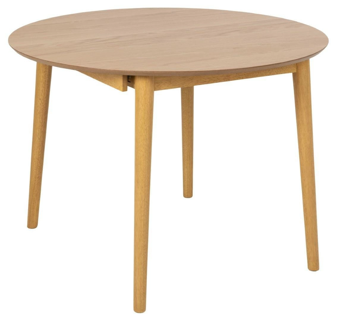 Stół Montreux jest w całości wykonany z drewna. Ma duży, okrągły blat pokryty fornirem z drewna dębu, w naturalnym odcieniu. Jest to z pewnością jego duży atut, ponieważ ten materiał charakteryzuje się niezwykłą wytrzymałością. Dodatkowo jest łatwy do utrzymania w czystości, do jego pielęgnacji wystarczy jedynie miękka ściereczka z wodą. Rogi blatu są ładnie zaokrąglone, a jego brzeg lekko ścięty, nadając mu łagodny, organiczny wygląd. Podstawa wykonana jest z drewna kauczukowego pobejcowanego na dębowy kolor dopasowany do blatu. Zaletą Montreuxa jest rozsuwany blat. Pod blatem głównym znajdują się blaty powiększające stół do szerkości 154 cm.