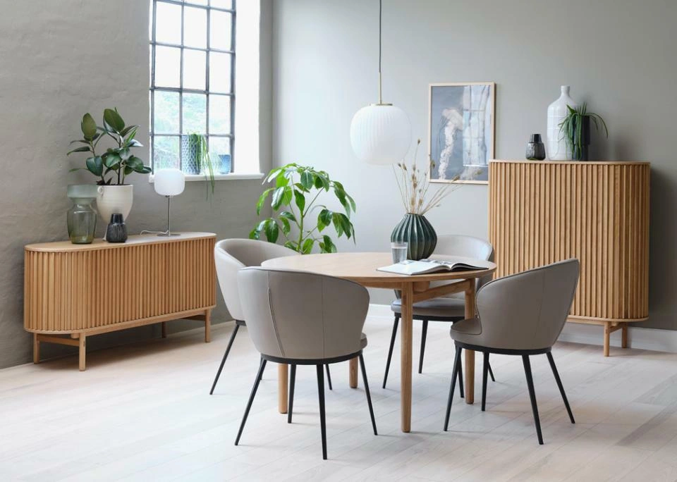 Carno świetnie wpisuje się w aranżacje, w których liczy się jasność, lekkość i ponadczasowy wygląd. Naturalny dąb oraz matowe wykończenie sprawiają, że stół prezentuje się spokojnie i elegancko, bez nadmiaru ozdobników. Dzięki temu z łatwością dopasujesz go zarówno do nowoczesnej jadalni, jak i przytulnej kuchni czy strefy diningowej w salonie.