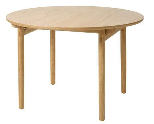 Stół okrągły rozkładany Carno 120 cm marki UNIQUE to fornirowany stół do jadalni i kuchni w naturalnym odcieniu dębu, osadzony na solidnych drewnianych nogach. Okrągły blat o średnicy 120 cm sprzyja swobodnym rozmowom przy posiłku, a możliwość rozłożenia daje większą elastyczność wtedy, gdy potrzebujesz dodatkowego miejsca przy stole.