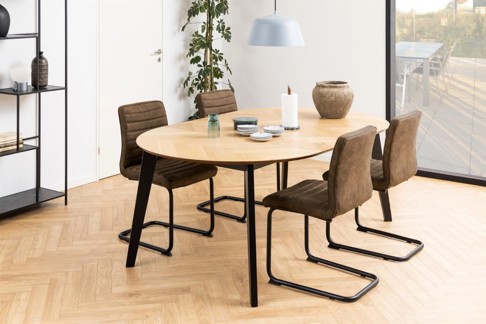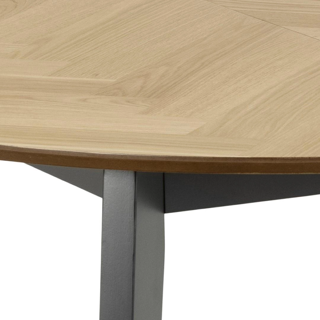 Stół Georgetown posiada okrągły blat z forniru dębowego, który charakteryzuje się równomiernym, dużym usłojeniem o jednolitej barwie. Oraz podstawę, na którą składają się cztery czarne nogi z drewna kauczukowego. Powierzchnia blatu pokryta jest wzorem jodełki, który tworzy stół jeszcze ciekawszym meblem. Georgetown przyciągnie uwagę nawet najbardziej wymagających koneserów. Stół jest rozkładany, jego blat można rozsunąć do szerokości 198 cm.