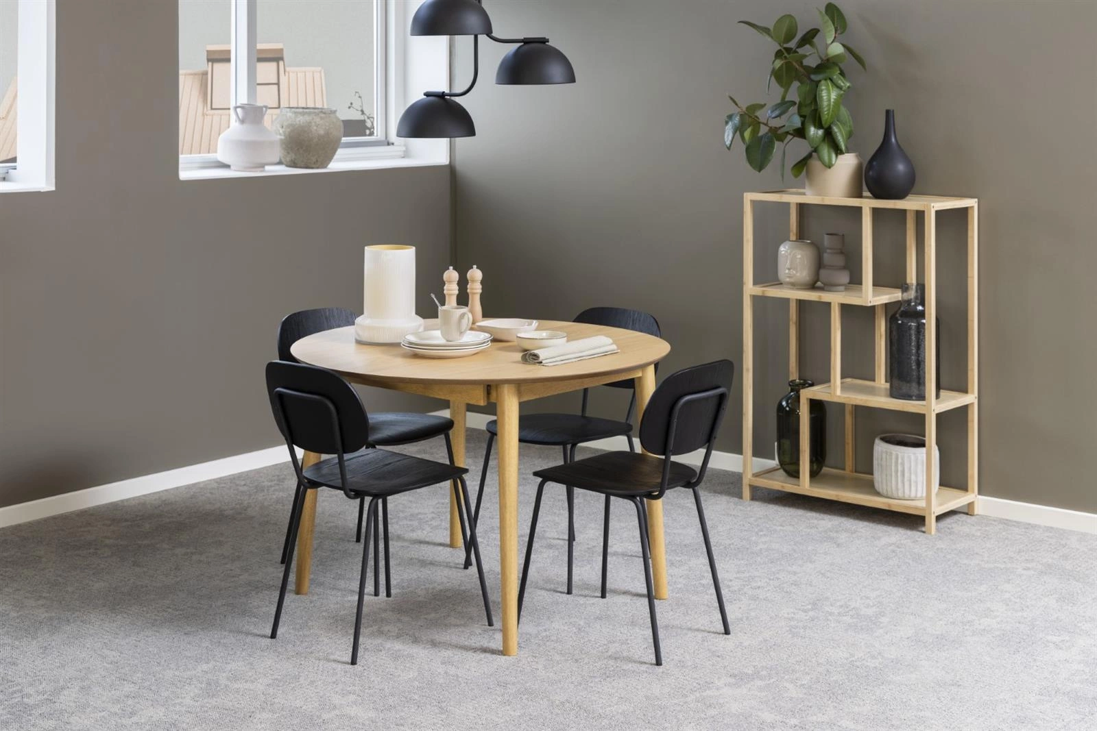 Stół Montreux jest w całości wykonany z drewna. Ma duży, okrągły blat pokryty fornirem z drewna dębu, w naturalnym odcieniu. Jest to z pewnością jego duży atut, ponieważ ten materiał charakteryzuje się niezwykłą wytrzymałością. Dodatkowo jest łatwy do utrzymania w czystości, do jego pielęgnacji wystarczy jedynie miękka ściereczka z wodą. Rogi blatu są ładnie zaokrąglone, a jego brzeg lekko ścięty, nadając mu łagodny, organiczny wygląd. Podstawa wykonana jest z drewna kauczukowego pobejcowanego na dębowy kolor dopasowany do blatu. Zaletą Montreuxa jest rozsuwany blat. Pod blatem głównym znajdują się blaty powiększające stół do szerkości 154 cm.