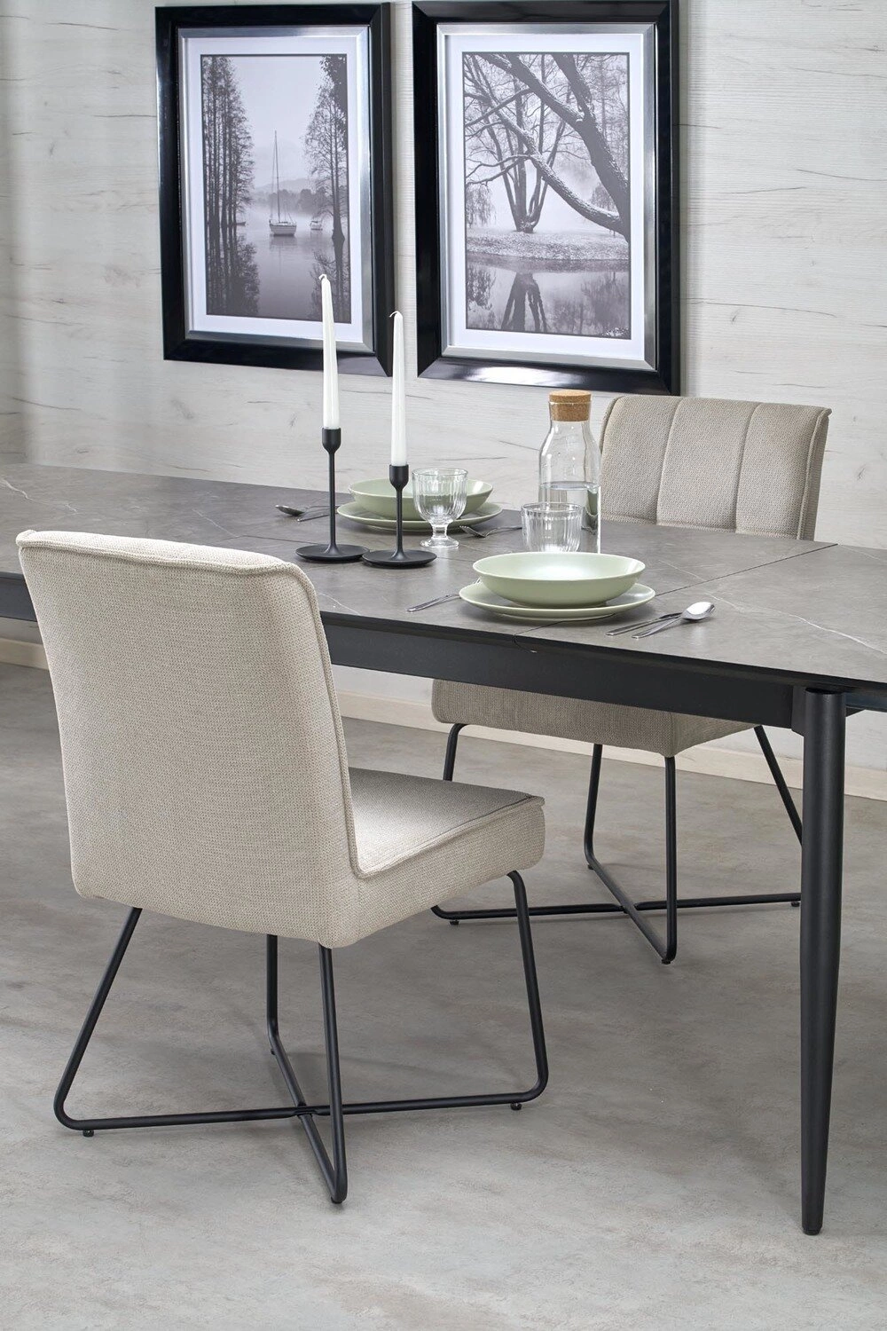 Rozkładany stół Ariaster w kolorze popielatego marmuru z czarnymi nogami to funkcjonalny i elegancki mebel, który idealnie wpisuje się w nowoczesne wnętrza. Dzięki możliwości rozłożenia od 180 cm do 260 cm, stół ten doskonale sprawdzi się zarówno podczas codziennych posiłków, jak i większych spotkań towarzyskich. Jego stylowy design, z blatem imitującym popielaty marmur, nadaje wnętrzu luksusowego charakteru, jednocześnie zapewniając praktyczność w codziennym użytkowaniu.