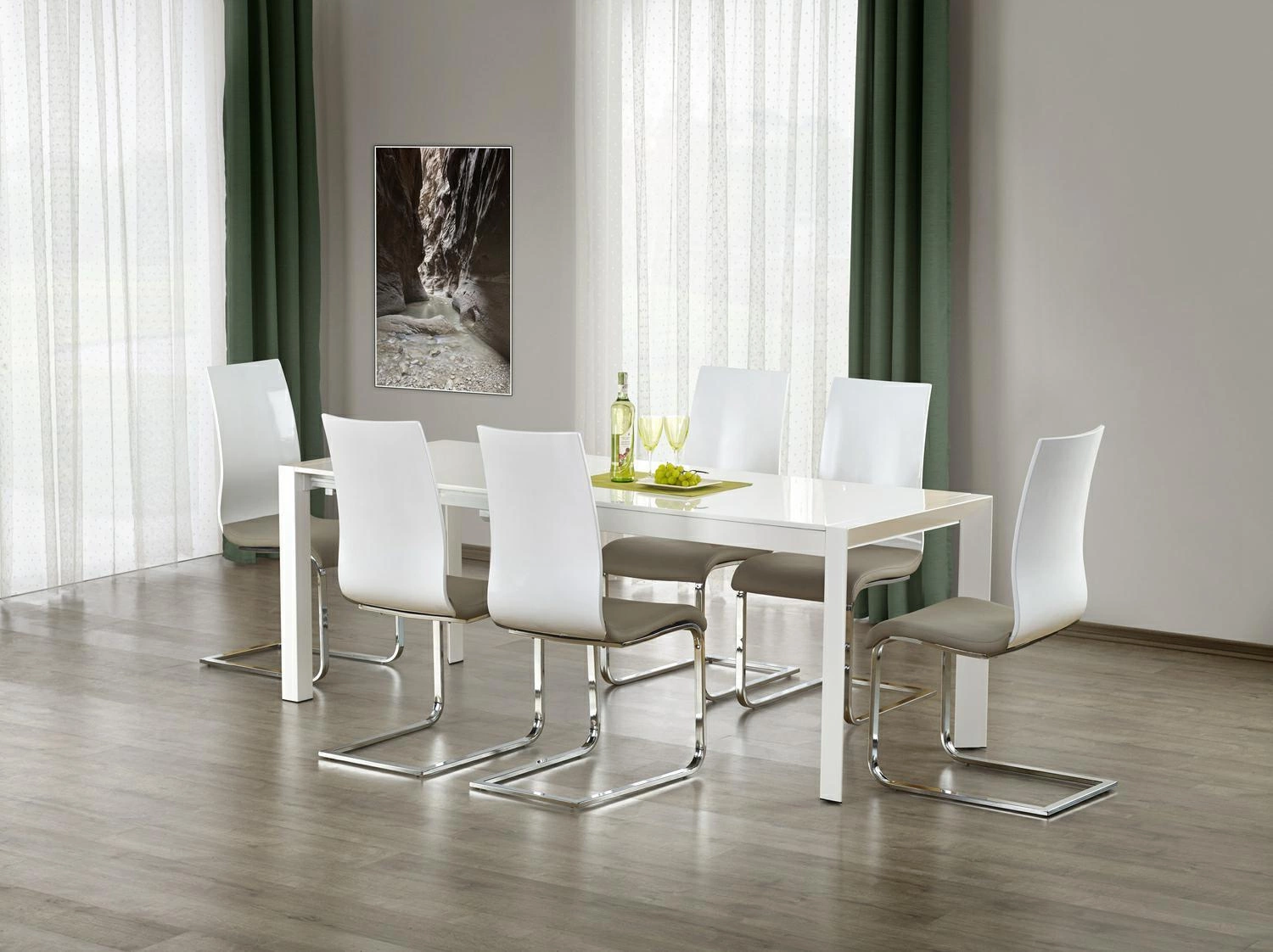 Uzyskaj nowoczesny wygląd glamour dzięki stołowi Foles od Intesi. Rozkładany stół został wykonany z lakierowanej płyty MDF i malowanej stali w kolorze białym. Idealny dla 8 lub 6 osób, prostokątny blat ma 4 nogi zapewniające stabilność.