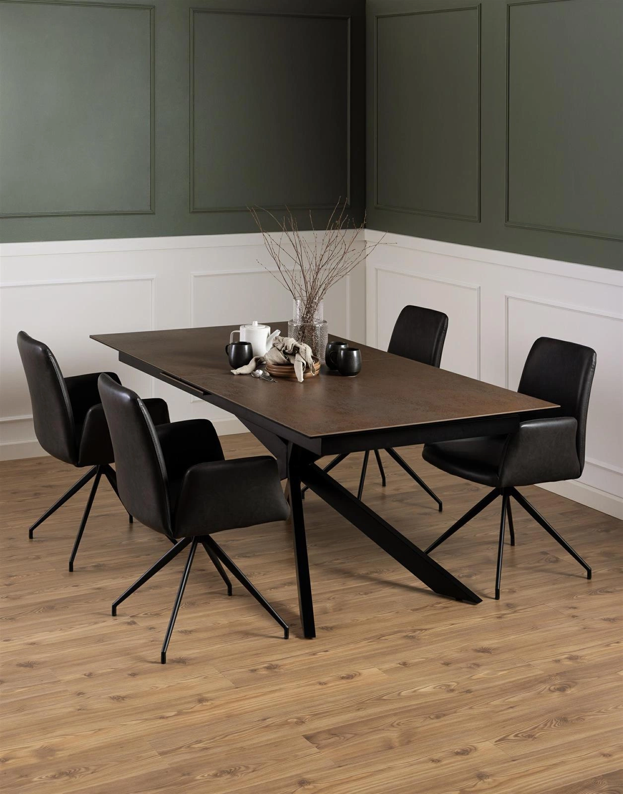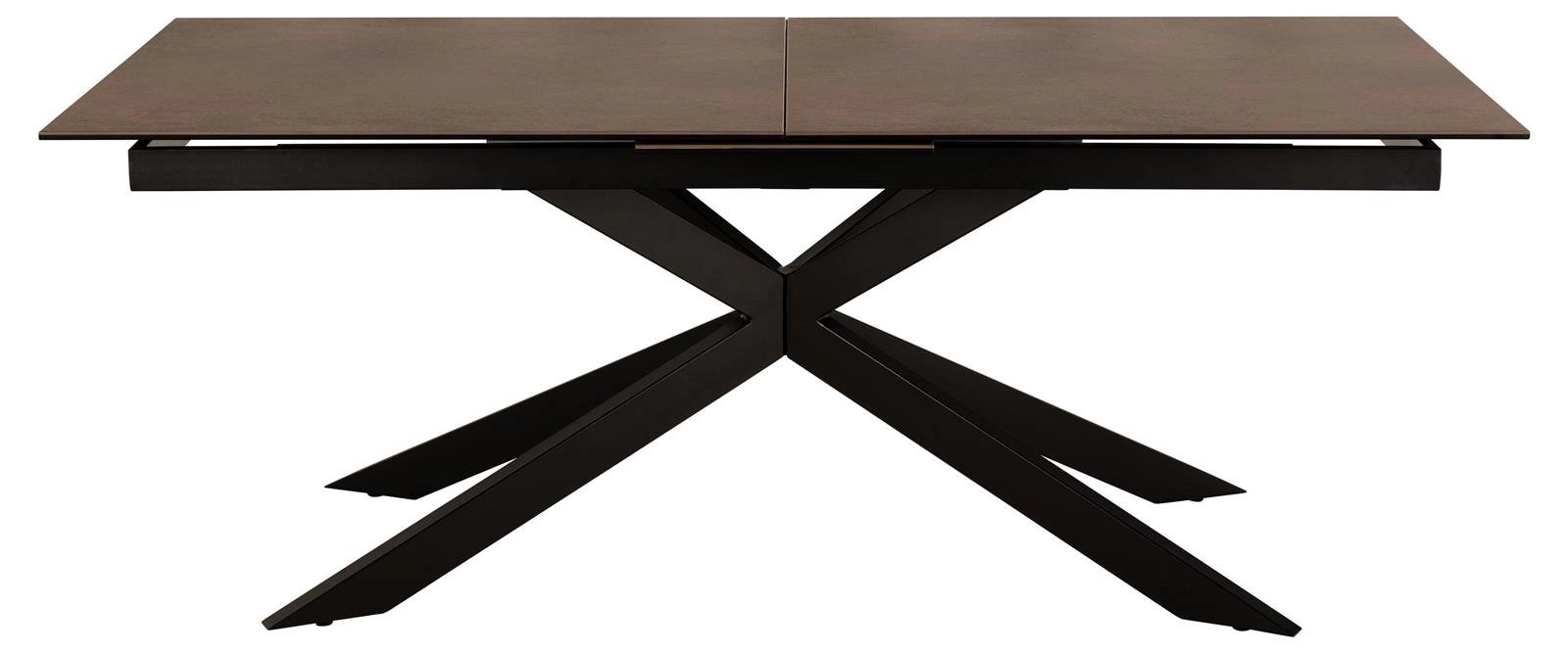 Rozkładany stół kuchenny Irwine ma rdzawobrązowy ceramiczny blat i czarną podstawę w kształcie krzyża, dzięki czemu może pomieścić od 8 do 10 osób. Łatwo powiększ powierzchnię za pomocą dodatkowego blatu i ciesz się odpornym na zarysowania, odpornym w dobrym stylu.