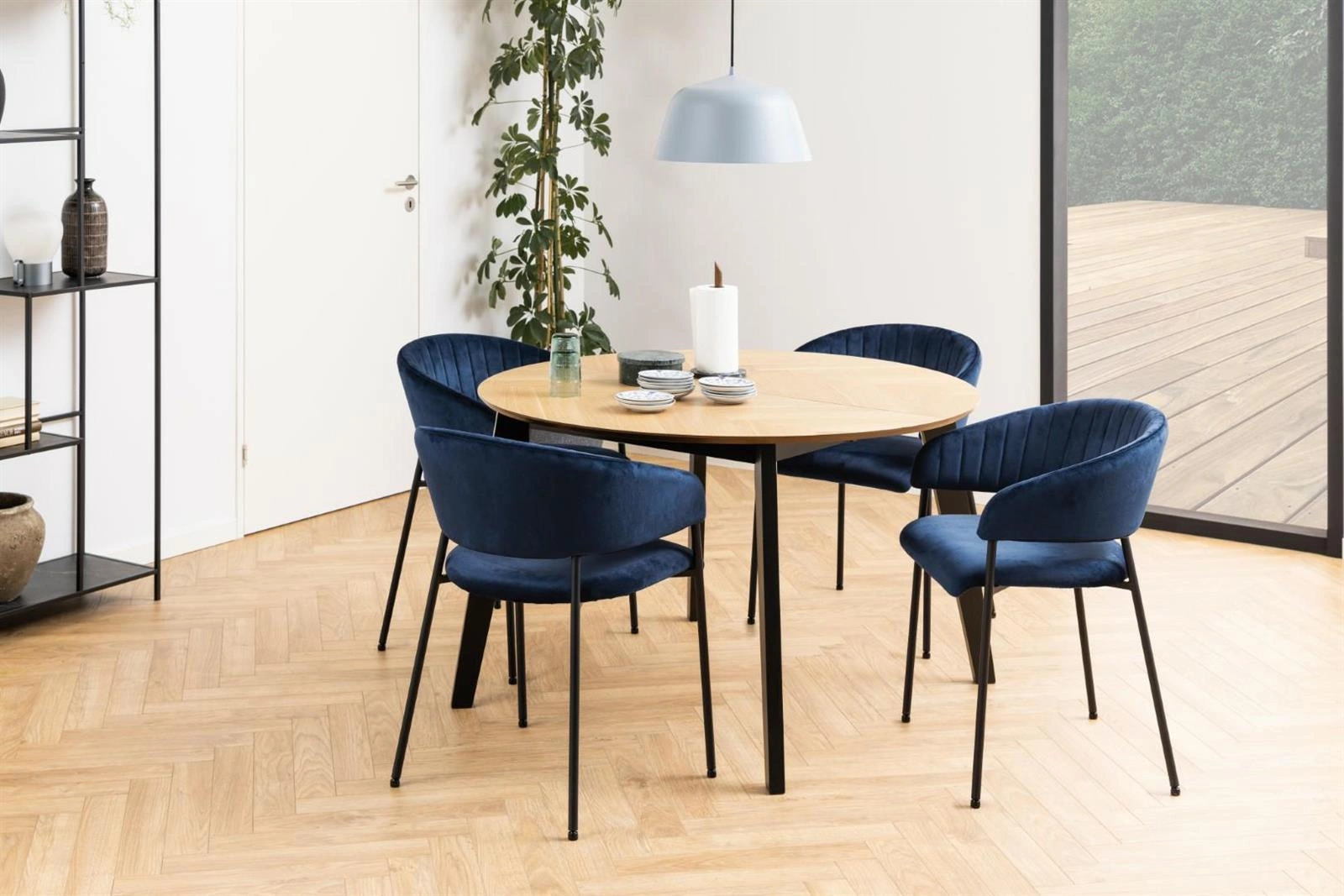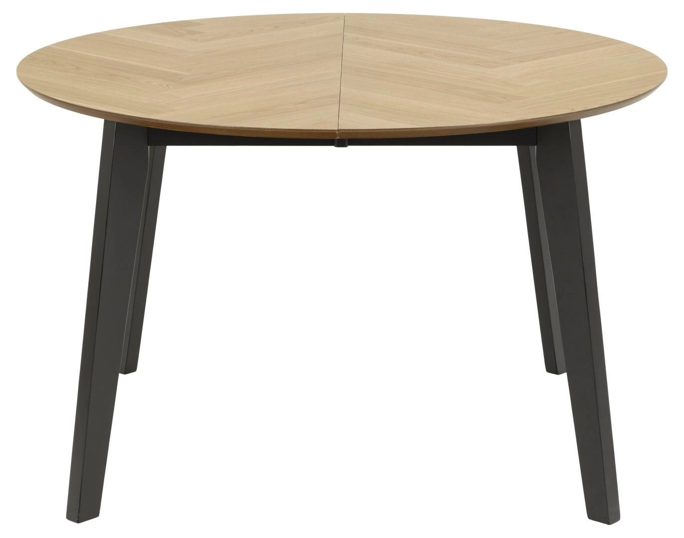 Stół Georgetown posiada okrągły blat z forniru dębowego, który charakteryzuje się równomiernym, dużym usłojeniem o jednolitej barwie. Oraz podstawę, na którą składają się cztery czarne nogi z drewna kauczukowego. Powierzchnia blatu pokryta jest wzorem jodełki, który tworzy stół jeszcze ciekawszym meblem. Georgetown przyciągnie uwagę nawet najbardziej wymagających koneserów. Stół jest rozkładany, jego blat można rozsunąć do szerokości 198 cm.