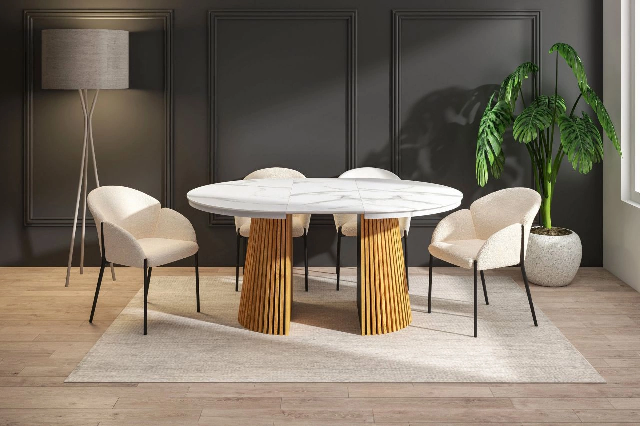 Stół rozkładany Kyoto okrągły 120/200cm to propozycja dla osób ceniących zarówno nowoczesny styl, jak i praktyczne rozwiązania w swoim wnętrzu. Dzięki możliwości łatwego powiększenia blatu z 120 cm aż do 200 cm, mebel ten doskonale sprawdzi się zarówno podczas codziennych posiłków, jak i większych spotkań rodzinnych czy towarzyskich. Okrągły blat w eleganckim wykończeniu imitującym biały marmur nadaje wnętrzu wyjątkowego charakteru, a solidna podstawa z naturalnym wykończeniem w kolorze dębu zapewnia stabilność oraz trwałość przez lata. To idealny wybór do jadalni, salonu lub kuchni, gdzie liczy się wygoda użytkowania i stylowy wygląd.