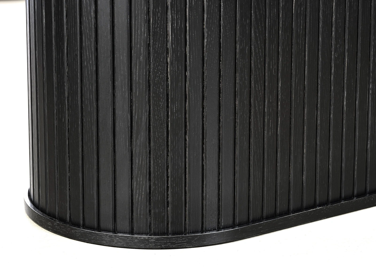 Nowoczesny stół do jadalni Lano zachwyca elegancką sylwetką oraz starannym wykończeniem inspirowanym naturalnym drewnem dębowym. Blat pokryty drewnianą okleiną w odcieniu czarnego dębu prezentuje się niezwykle szlachetnie i jest przyjemny w dotyku. Matowa powierzchnia nie tylko efektownie wygląda, ale także pozwala utrzymać stół w czystości nawet przy intensywnym użytkowaniu. Owalny kształt blatu sprzyja swobodnej rozmowie i tworzy przytulną atmosferę podczas każdej okazji.