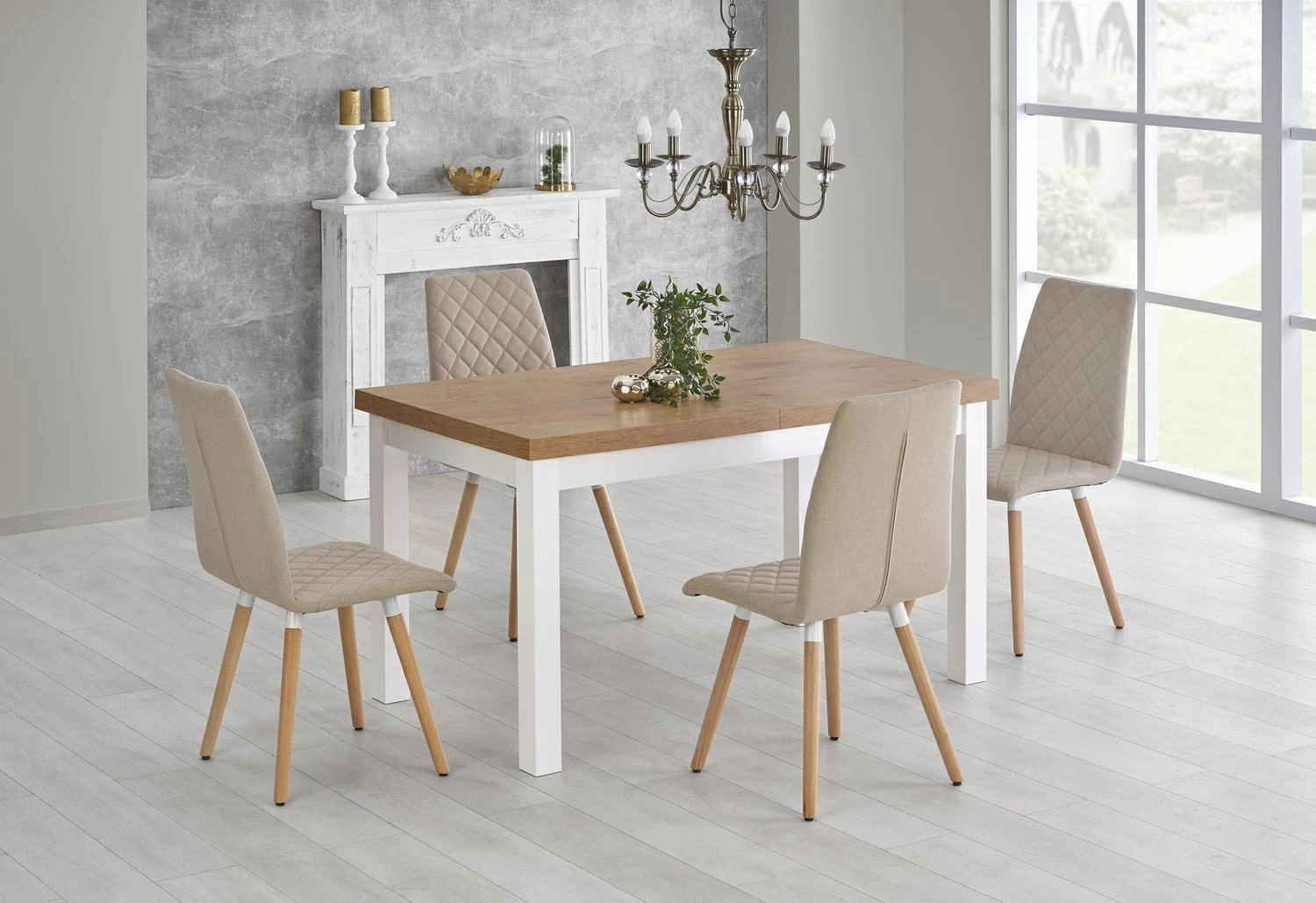 Blat stołu Tiago wykonany jest z trwałej płyty meblowej laminowanej, która jest łatwa w utrzymaniu czystości. Kolor blatu w odcieniu dębu lancelotu nadaje stołu elegancji i ponadczasowego charakteru. Nogi stołu wykonane są z drewna litego bukowego, które gwarantuje stabilność i solidność konstrukcji. Kolor białych nóg wprowadza subtelny akcent do designu stołu. Styl wykonania stołu Tiago to połączenie skandynawskiego minimalizmu, tradycyjnego uroku i boho swobody. To mebel, który doskonale wpisuje się w różnorodne aranżacje wnętrz, dodając im charakteru i osobowości. Wybierając Tiago, inwestujesz w jakość, wygodę i piękno w jednym. Ciesz się niezapomnianymi chwilami spędzanymi wokół tego eleganckiego stołu.