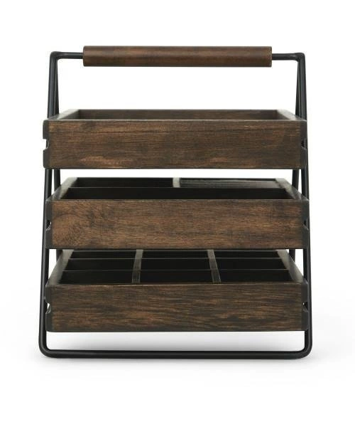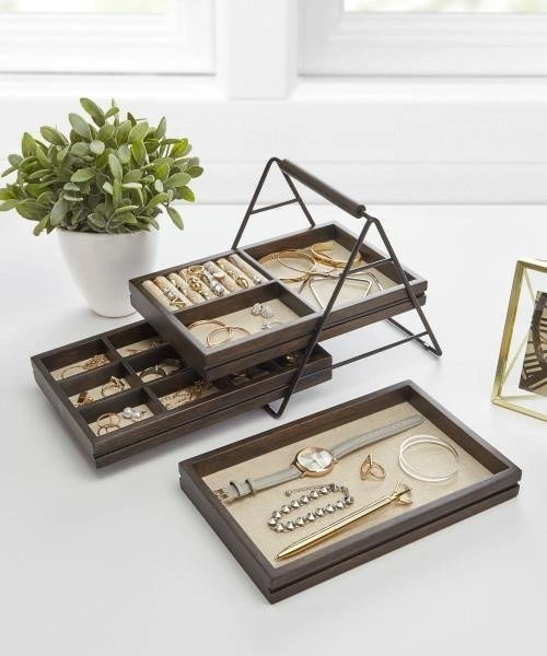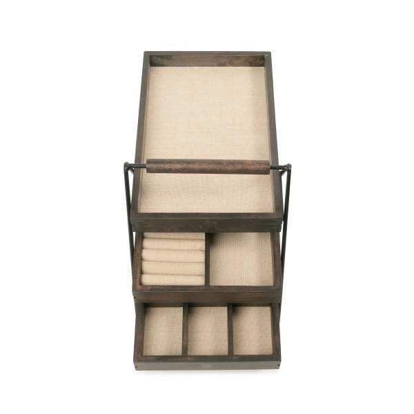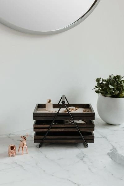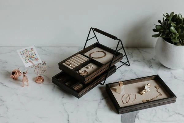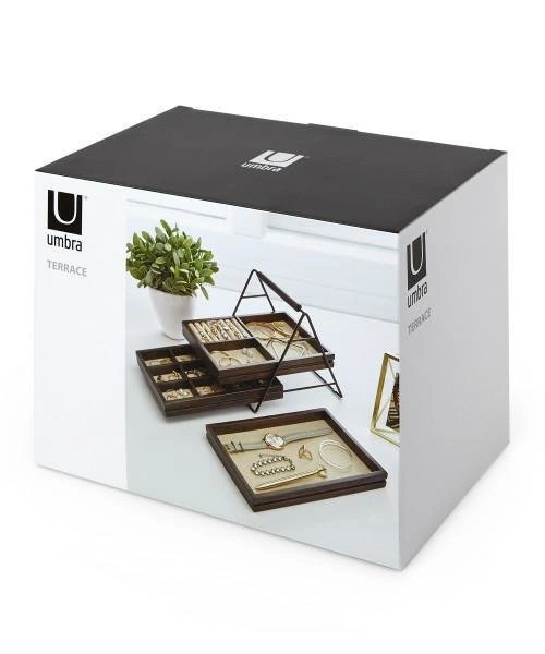 Organizer Terrace wykonany został z drewna kauczukowego, metalu oraz miękkiej gąbki do wyrobów jubilerskich pokrytej welurem zapobiegającym zarysowaniom takich przedmiotów jak biżuteria czy zegarki. Trzy półki pomieszczą wszystkie najważniejsze i najbardziej drogocenne rodzaje biżuterii. Każda półka ma inny rozkład dzięki czemu znajdziesz w nich miejsce dedukowane dla pierścionków, zegarków, bransoletek czy kolczyków. Dodatkowym atutem jest możliwość przekładania oraz wyjmowania półek co ułatwiają boczne wżłobienia w drewnie.