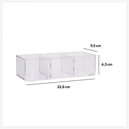 Jego trzy przegródki umożliwiają uporządkowanie i wygodne przechowywanie różnorodnych przedmiotów. Odpowiednie wymiary (wysokość: 6,3 cm, szerokość: 22,8 cm, głębokość: 9,5 cm) zapewniają wystarczającą pojemność, jednocześnie pozwalając na umieszczenie pudełka w różnych miejscach, również tych o ograniczonej przestrzeni. Pudełko z serii Selena doskonale sprawdzi się na łazienkowej półce, toaletce czy w szufladzie, pomagając utrzymać porządek i uporządkować kosmetyki lub akcesoria do pielęgnacji osobistej. Jego praktyczny design oraz łatwość w czyszczeniu sprawiają, że jest nie tylko funkcjonalnym, lecz także estetycznym dodatkiem do codziennej organizacji. Dzięki niemu można łatwo i wygodnie przechowywać najpotrzebniejsze przedmioty w jednym miejscu, co ułatwia utrzymanie porządku w domu.