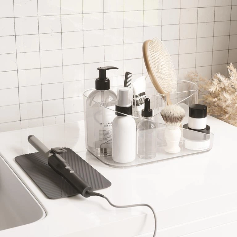 Organizer Glam II został zaprojektowany z myślą o osobach, które cenią praktyczne rozwiązania i estetyczny wygląd łazienki czy toaletki. Przegródki umożliwiają oddzielenie pędzli, tuszów do rzęs, lakierów do paznokci czy drobnych akcesoriów do włosów. Transparentny materiał nie tylko nadaje lekkości, ale także pozwala łatwo zlokalizować potrzebny przedmiot bez konieczności przeszukiwania całej zawartości pojemnika. To organizer na kosmetyki, który pomaga utrzymać porządek i zaoszczędzić czas każdego dnia.