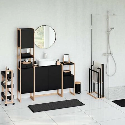 Czarna szafka na papier toaletowy z serii Natureo to połączenie elegancji i funkcjonalności. Jej minimalistyczny design i klasyczny czarny kolor sprawiają, że doskonale komponuje się z różnymi stylami wnętrz, dodając im niepowtarzalnego charakteru. Szafka jest również wyjątkowo praktyczna - dzięki swoim kompaktowym wymiarom idealnie sprawdzi się w małej łazience, jednocześnie zapewniając odpowiednią ilość przestrzeni do przechowywania papieru toaletowego.