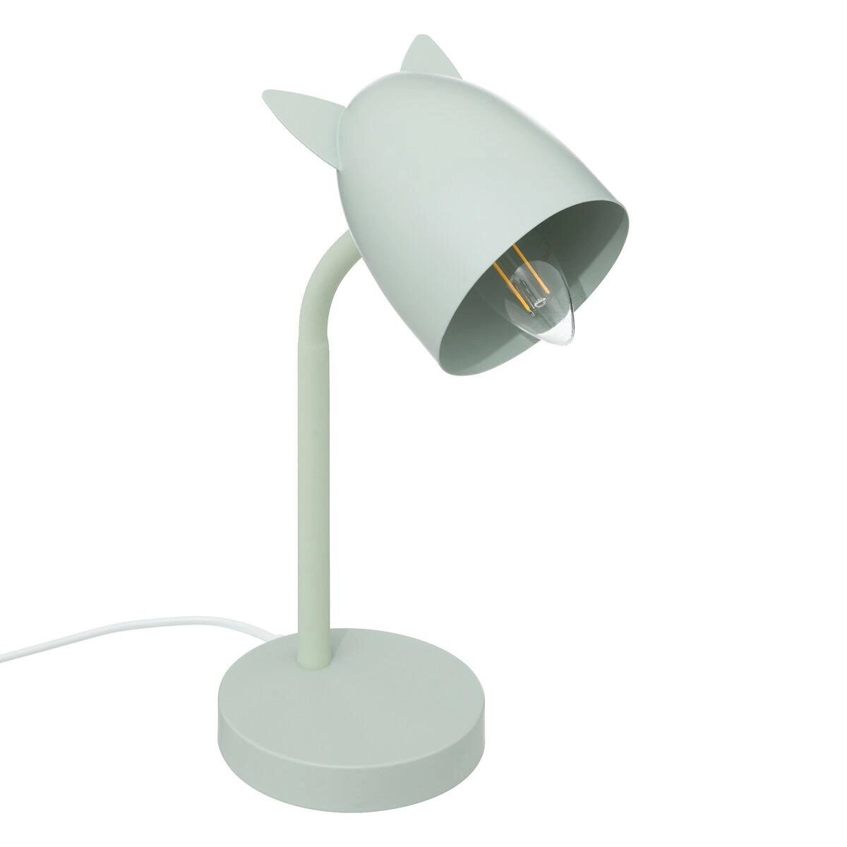 Lampka Ears w kolorze zielonym to doskonałe oświetlenie, które pasuje do pokoju dziecięcego lub nastolatka. Jej wyjątkowy kształt z kloszem ozdobionym uszami nadaje uroku i przytulności każdemu wnętrzu. Regulowany kąt klosza pozwala dostosować oświetlenie do konkretnych potrzeb, a ledowa żarówka zapewnia delikatne, miłe dla oka światło idealne do użytku przy biurku.